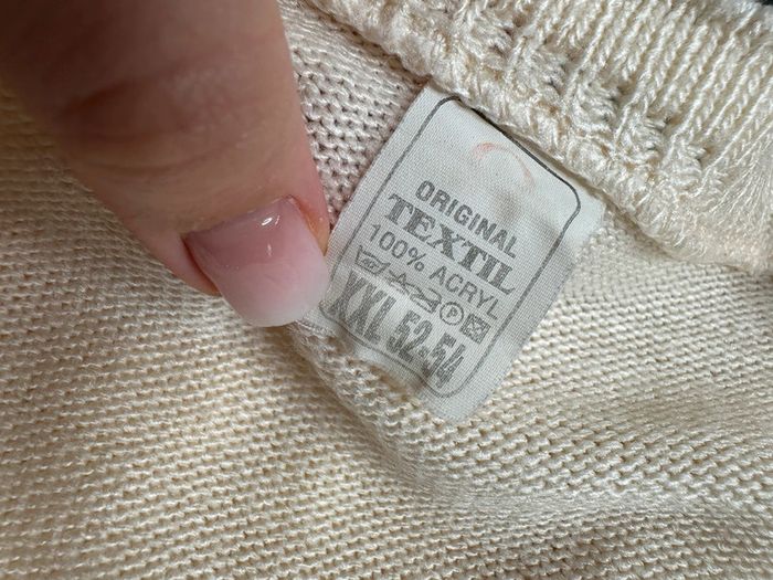Pull en maille torsades - Excellent état - Taille 52/54 XXL sur l’étiquette - Beige abricot - Maille torsades - Petite épaulettes (possibilité de les retirer) - Col en V - 100% Acrylique - Ultra doux et chaud - Vintage, années 90’