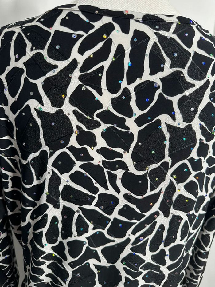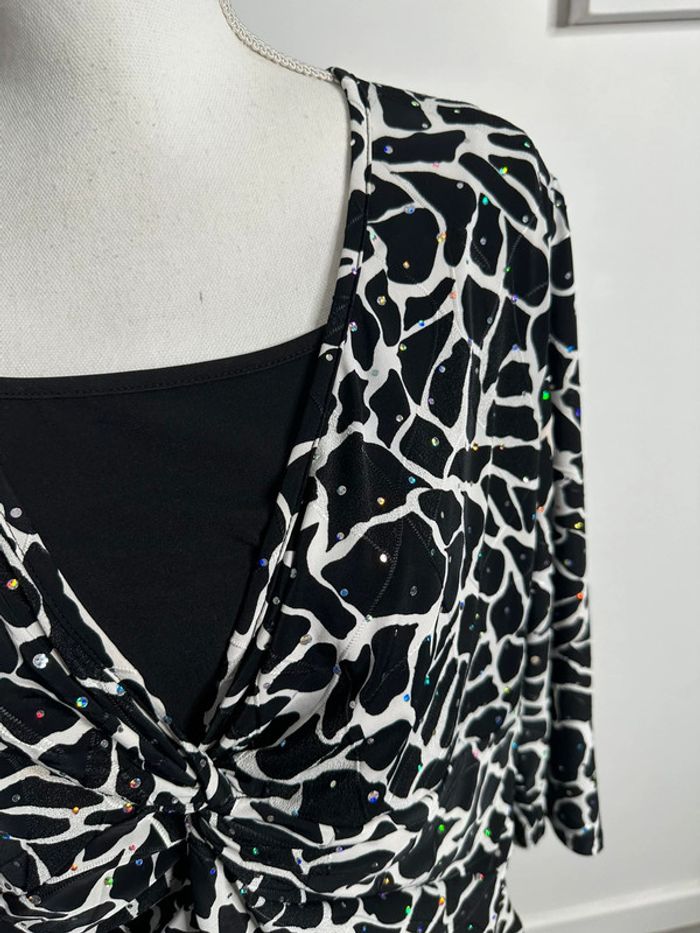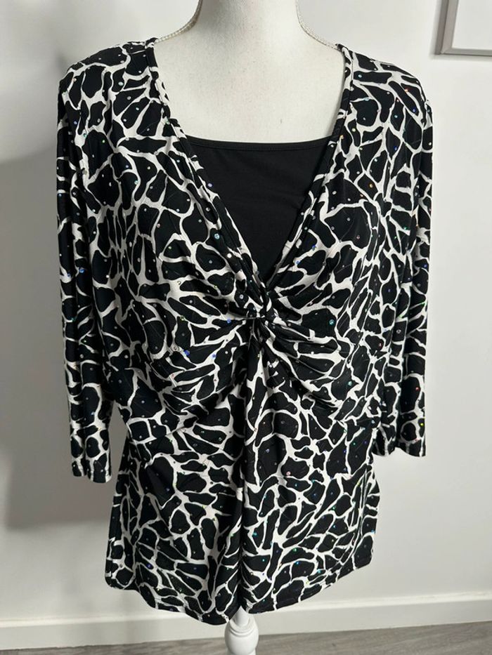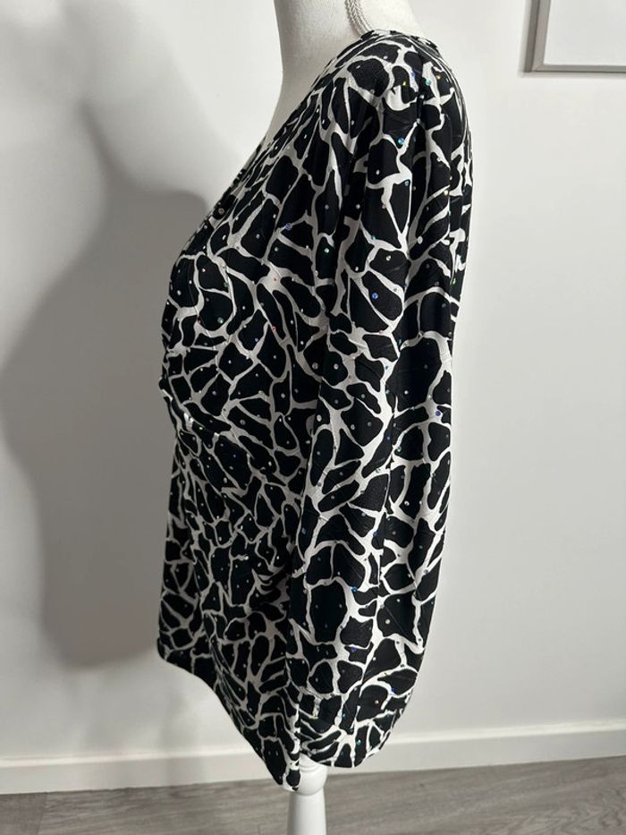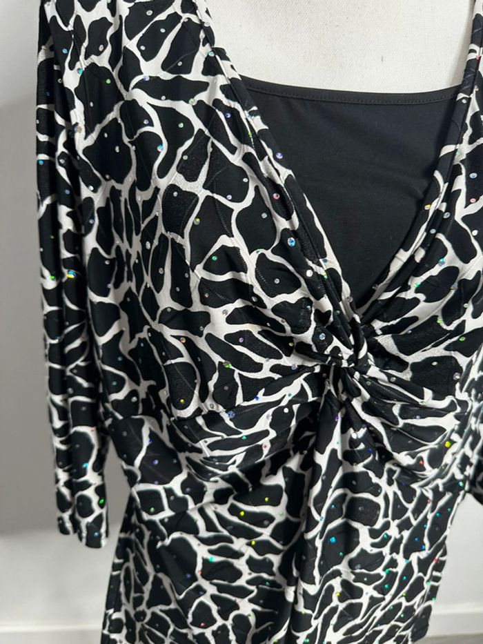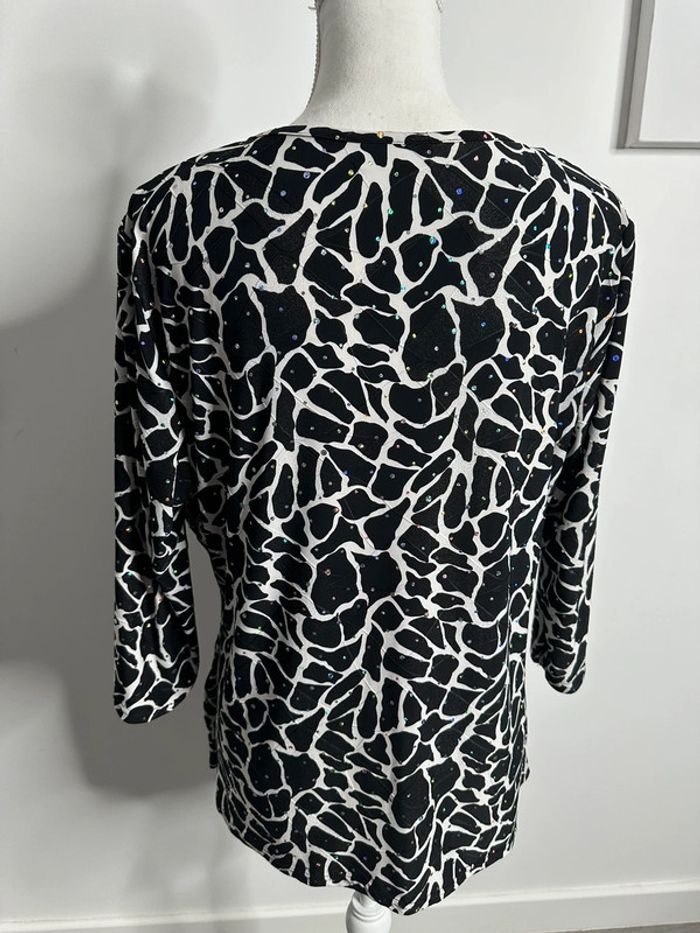 Blouse girafe - Excellent état - Taille 50 équivalent 5XL - Noire blanche et multicolore - Imprimés girafe - Manches 3/4 - Marque Canda - Paillettes multicolores - Polyester et élastane Dimensions: - 58 à 75cm niveau aisselle - 68cm de long