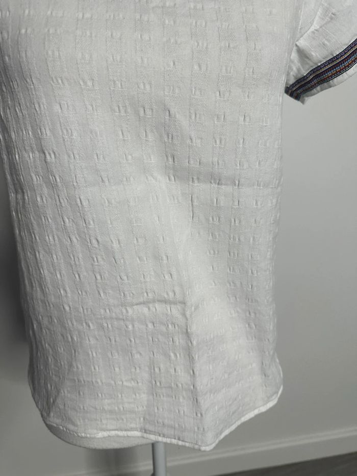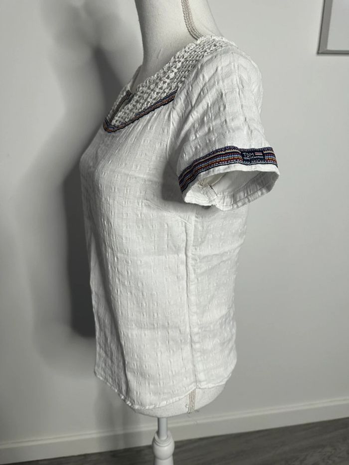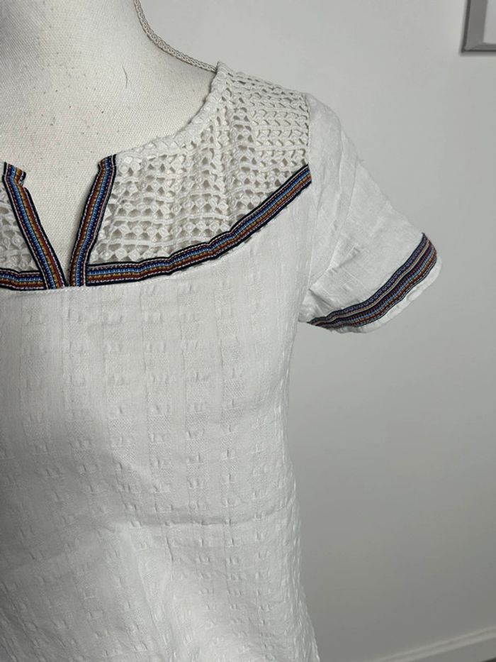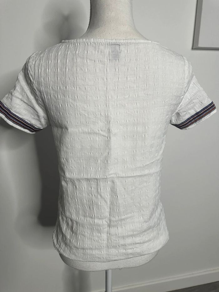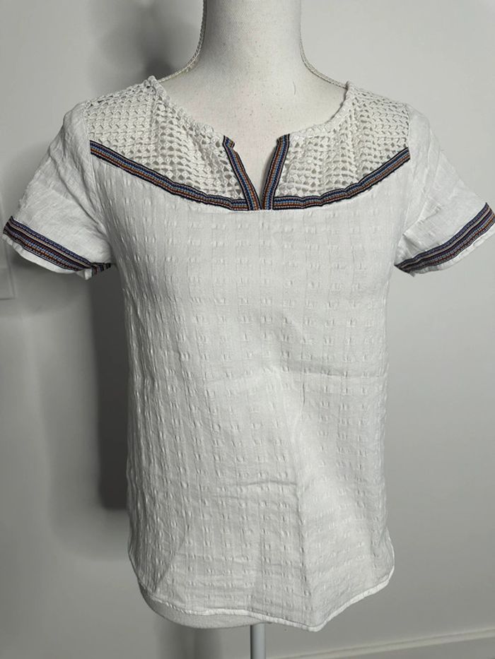 Blouse blanche et multicolore - Excellent état - Terre de marins TDM - Taille 36 équivalent S - Blanche et multicolore - Manches courtes - Ajourée au niveau du col - Détails multicolore au niveau du col et des manches - Plus d’étiquette de matière