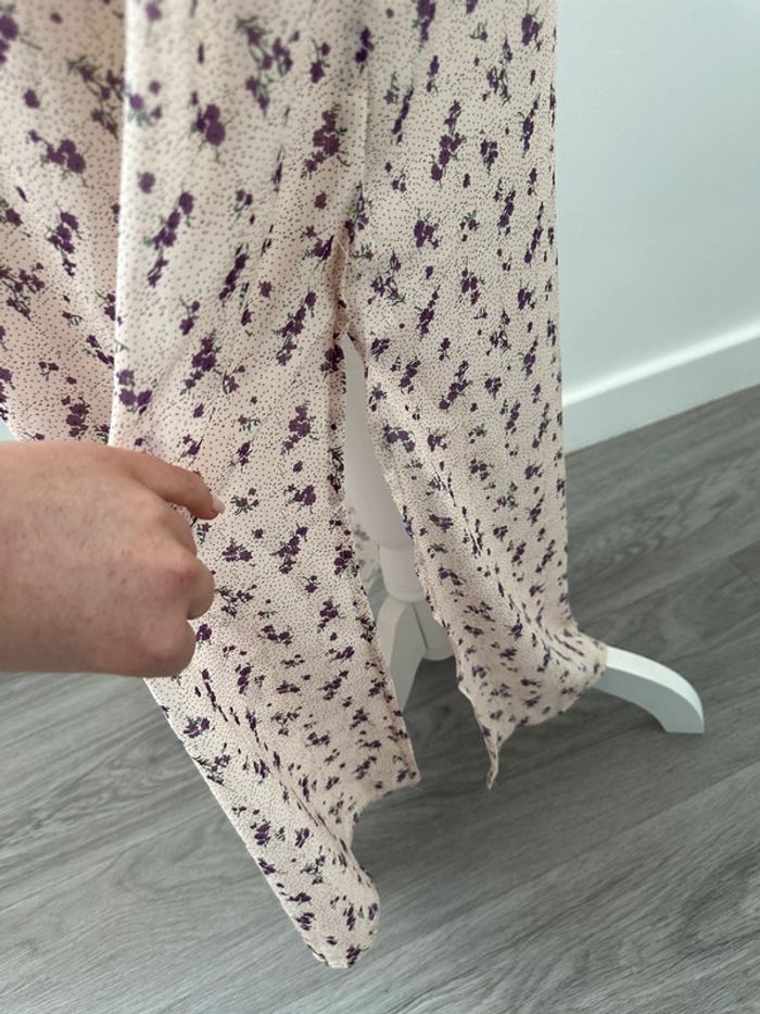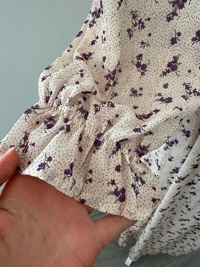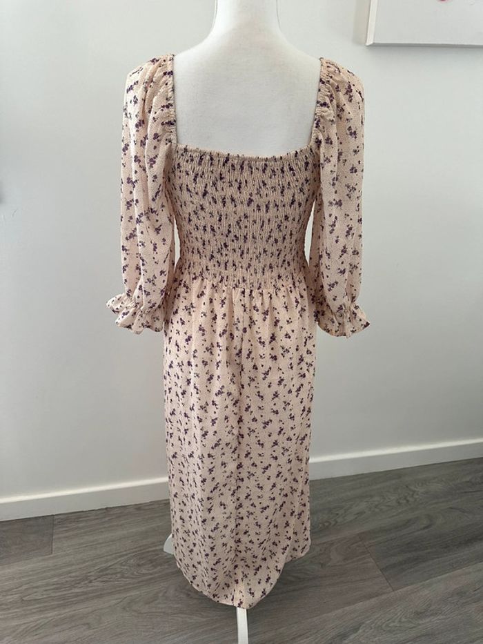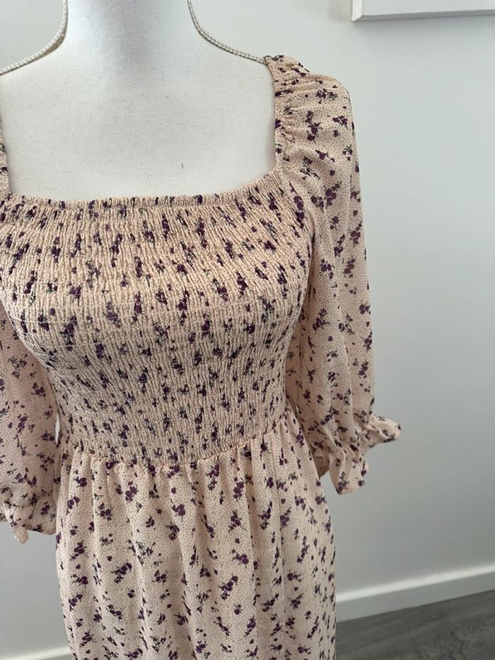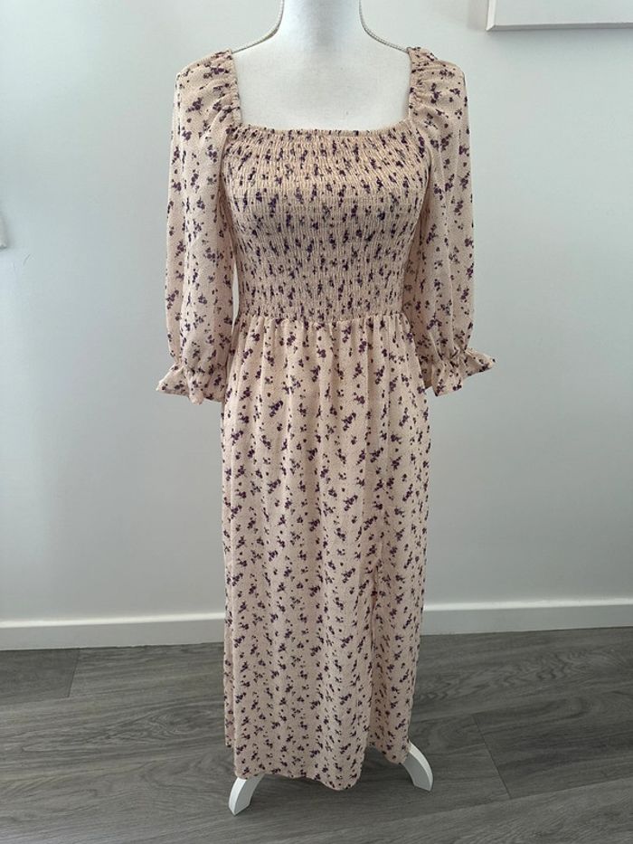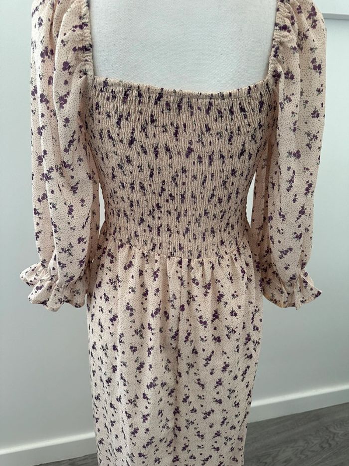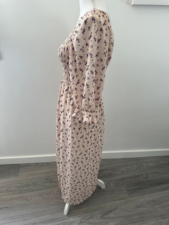 Robe longue à fleurs - Excellent état - Taille 38 équivalent M - Beige crème et violette - Élastique au niveau du buste - Imprimés fleurs - Vintage, années 90’ - Légèrement fendu sur le bas - Élastique au niveau des manches - Plus d’étiquette de taille ni de matière