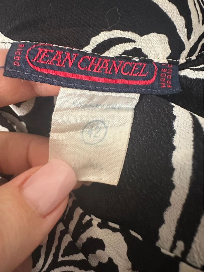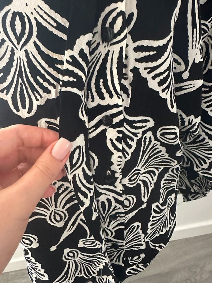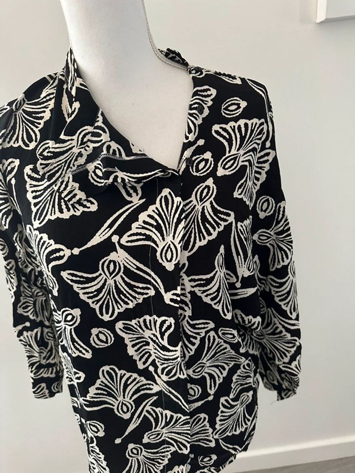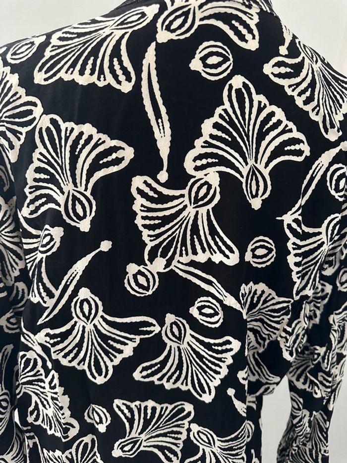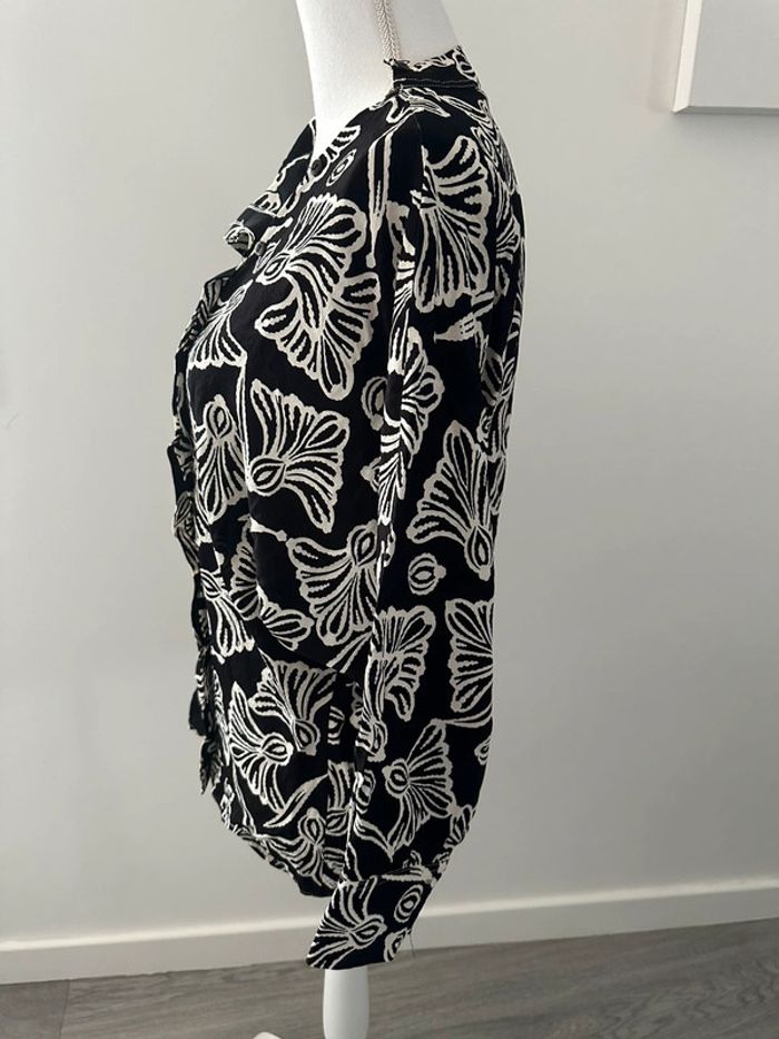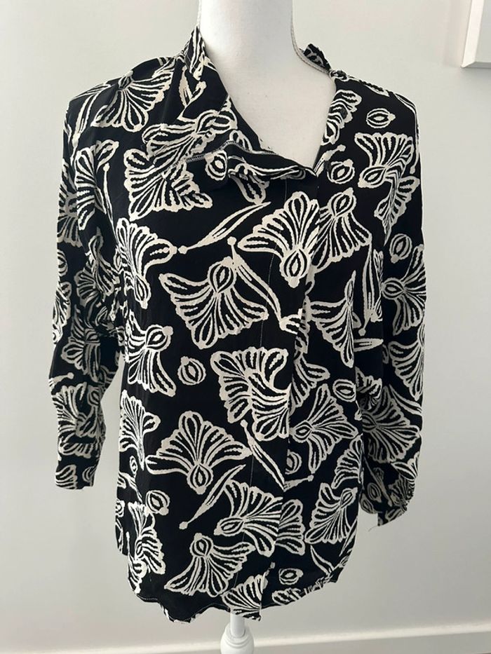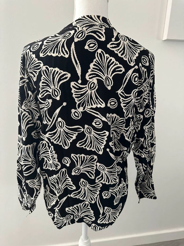 Blouse à manches longues - Excellent état - Taille 42 équivalent XL - Noire et blanche - À manches longues - Col volontairement de travers - Se ferme avec des boutons - Fabrication française 🇫🇷 - Vintage, années 90’ - Tissus bariolée fleurs