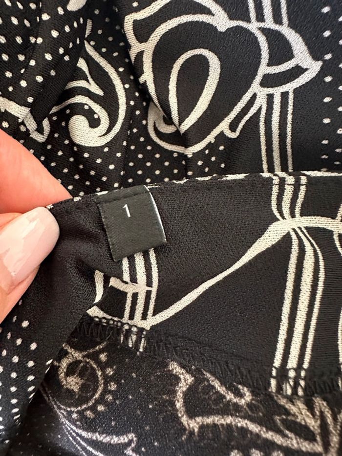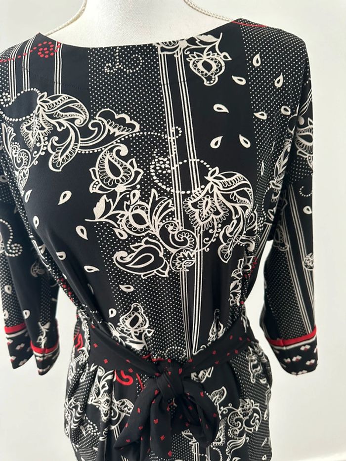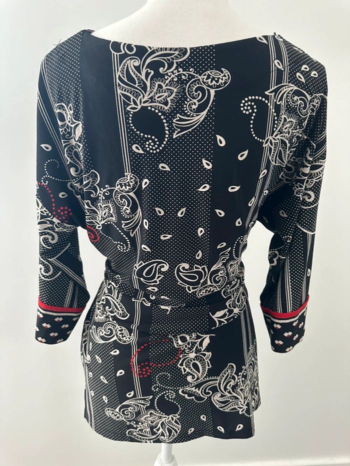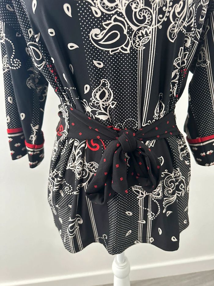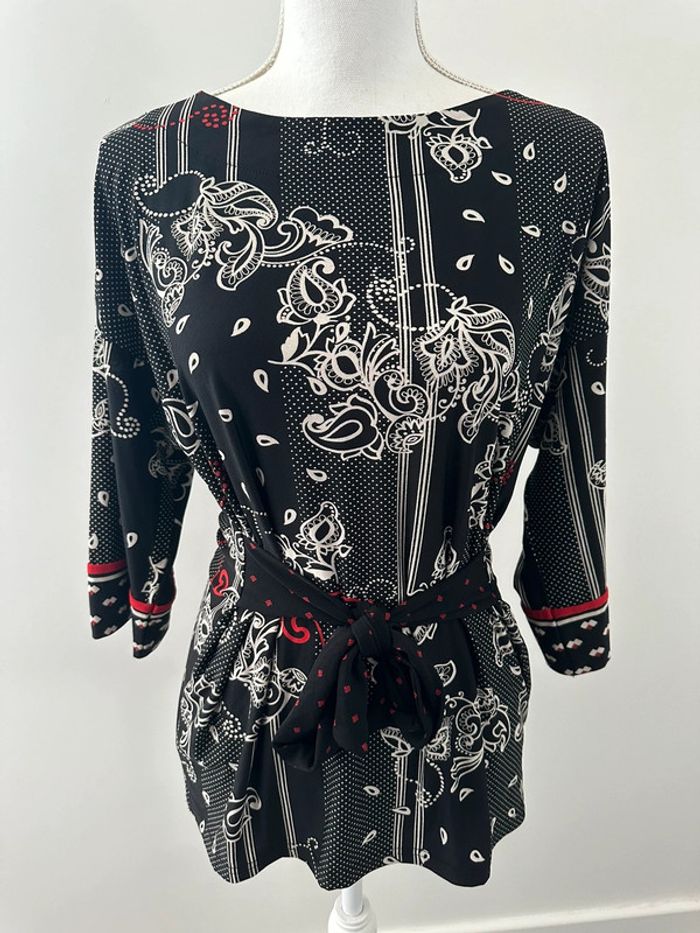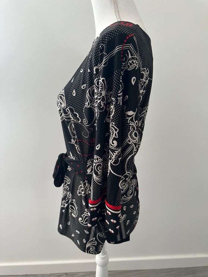 Blouse bariolée - Excellent état - Taille 1 équivalent 36 S - Noire blanche et rouge - Imprimés dentelle - Lien à la taille à nouer sur l’avant ou l’arrière - Manches 3/4 - Tissus fluide - Plus d’étiquette de matière