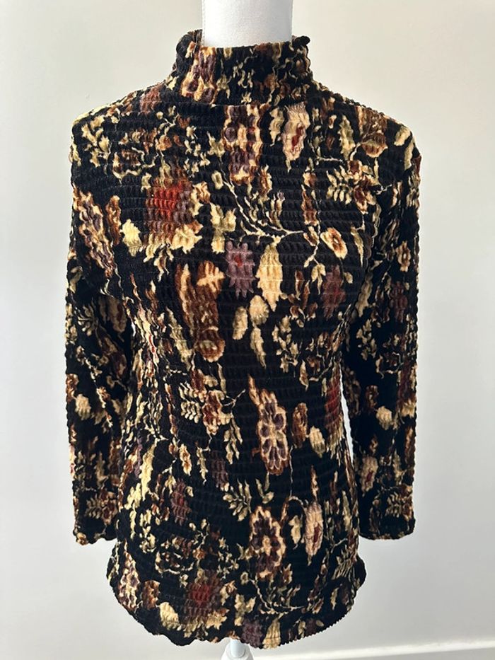 Pull à fleurs - Excellent état - Noir et beige - Taille unique (ok du 36 au 42) - Imprimés fleurs - Col haut - Tissus ultra stretch texturé - Ultra doux et chaud - 100% Viscose - Vintage, années 90’