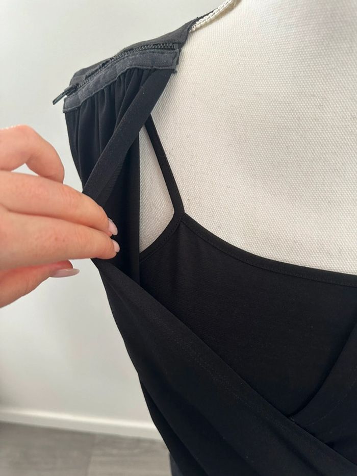 Robe noire drapée - Excellent état - Taille 38 équivalent M - Couleur noire - Haut drapée avec caraco intégré - Bas en dentelle avec doublure intérieure - Zip sur le côté - Marque IKKS - Polyester, elastane, polyamide et viscose