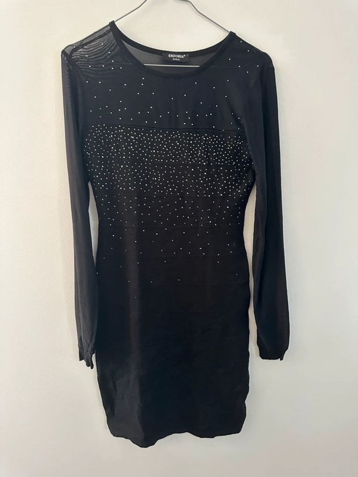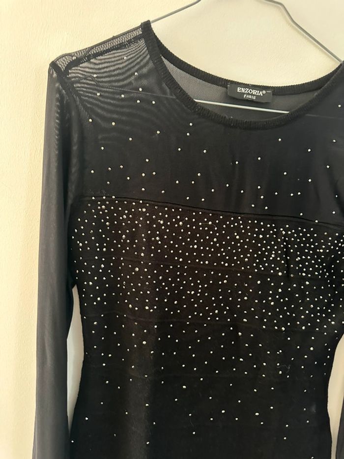 Petite robe noire - Excellent état - Taille unique équivalent 38 - Noire et strass argentés - Viscose et polyester - Manches et haut en mesh - Effet robe pull