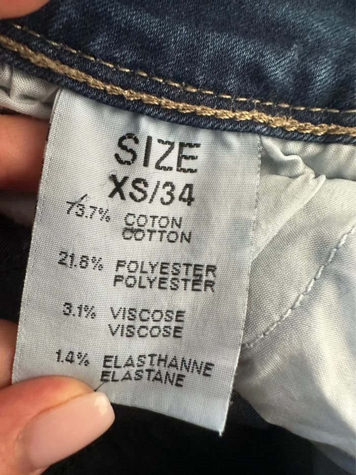 Jean denim - Excellent état - Taille 34 équivalent XS - Coupe skinny slim - Effet délavé - Coton, polyester, viscose et elastane - Bleu et blanc