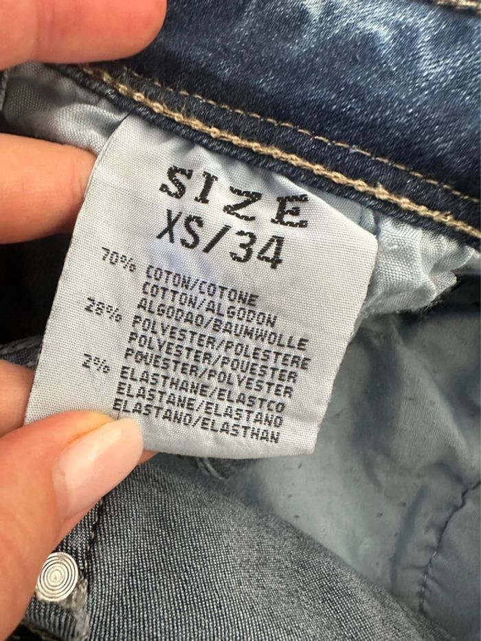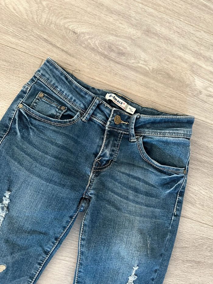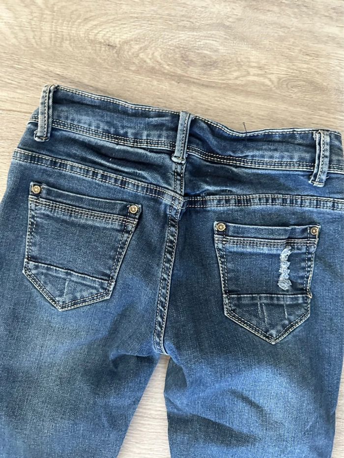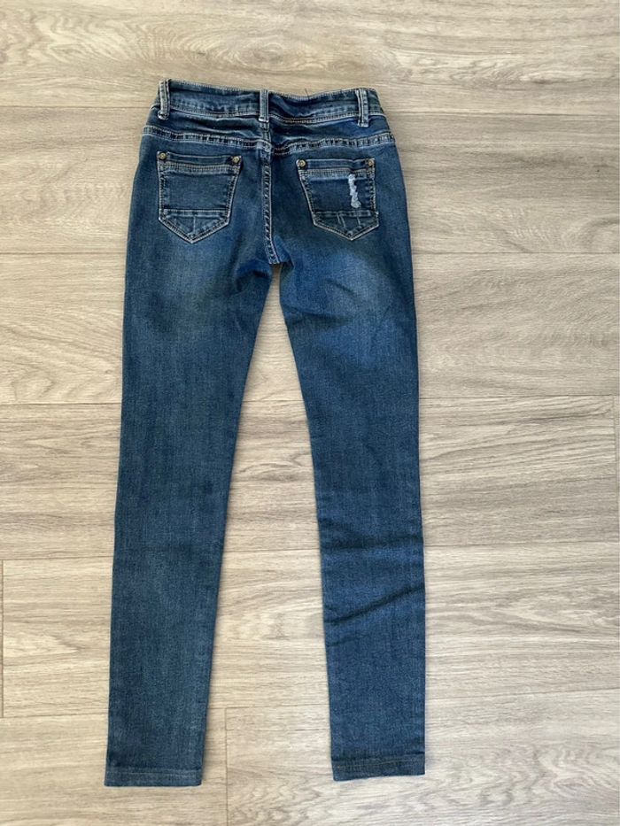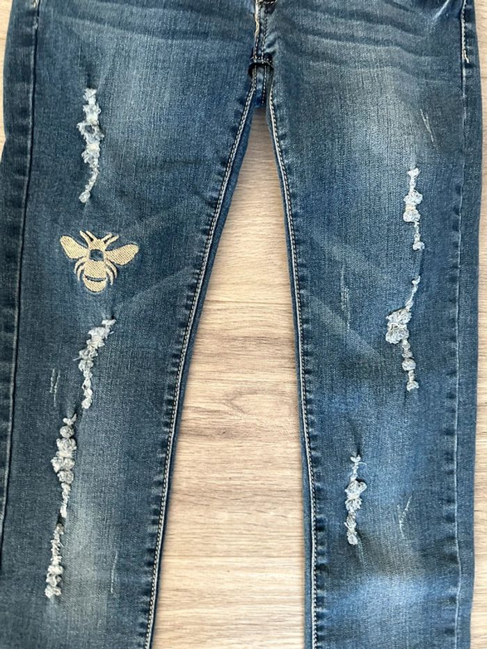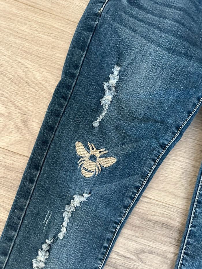 Jean denim skinny slim - Excellent état - Taille 34 équivalent XS - Bleu délavé effet destroy - Broderie abeille sur une cuisse - Coton, polyester et elastane - Style 2YK