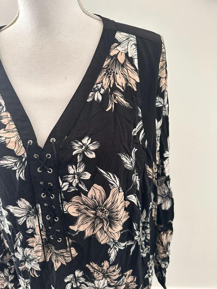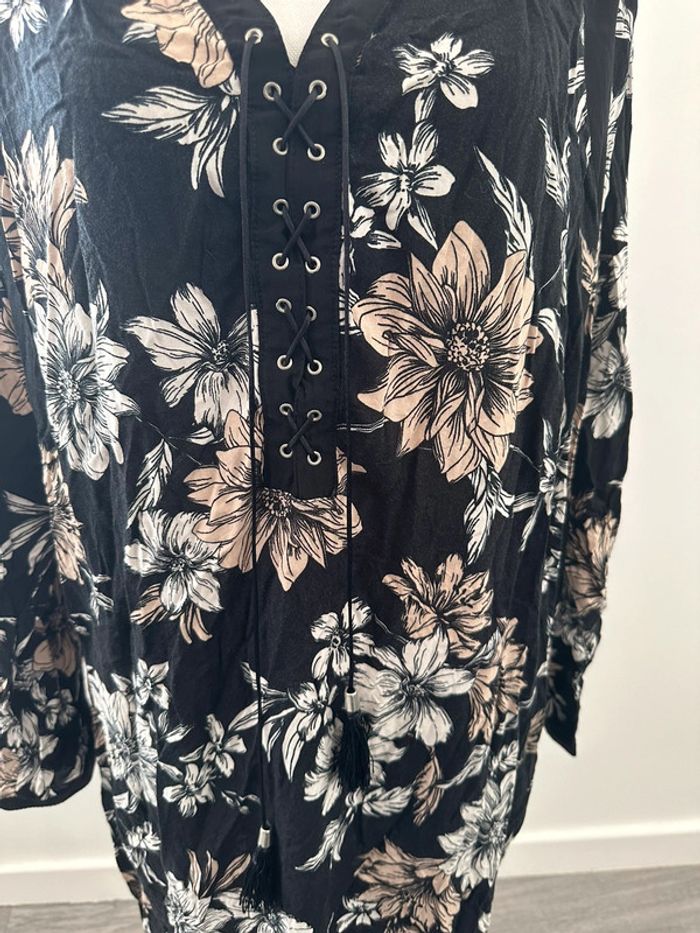 Robe longue à fleurs - Excellent état - Taille 50 équivalent 5XL - M&S Mode - Imprimés fleurs - Noire blanche et beige - Col en V - Liens au niveau du décolleté - Viscose et polyester Dimensions: -70cm niveau aisselle -100cm de long