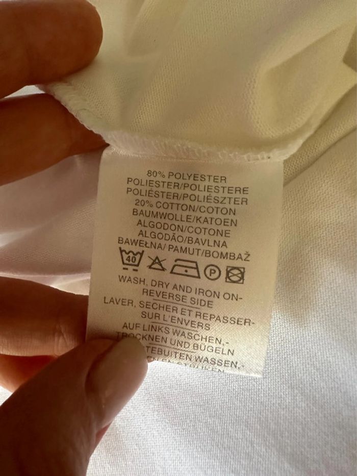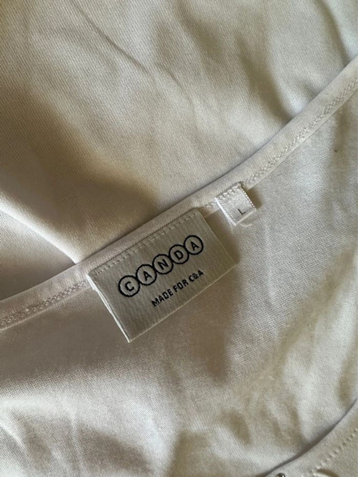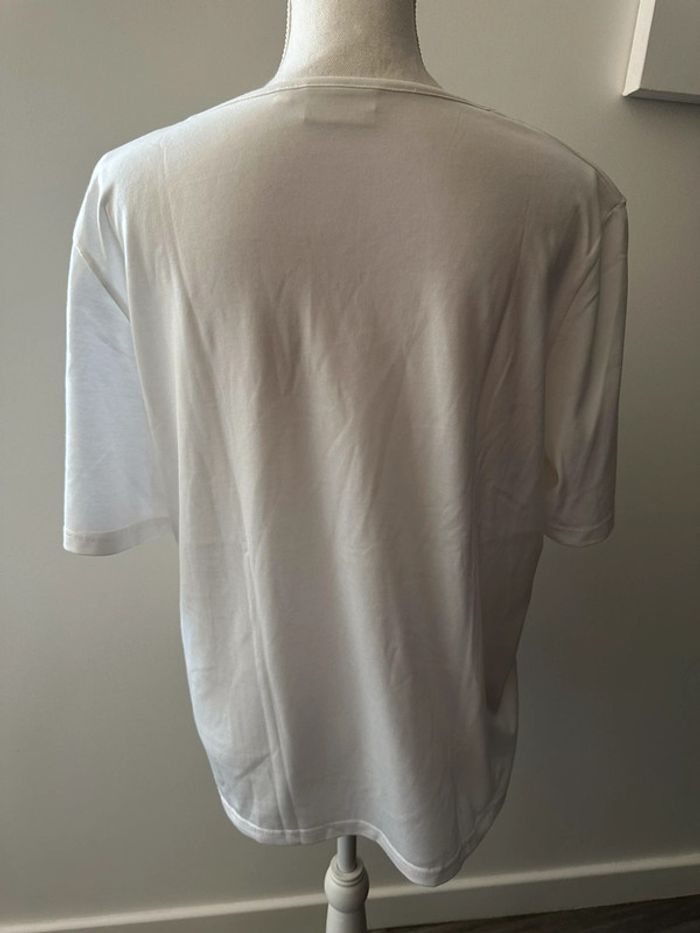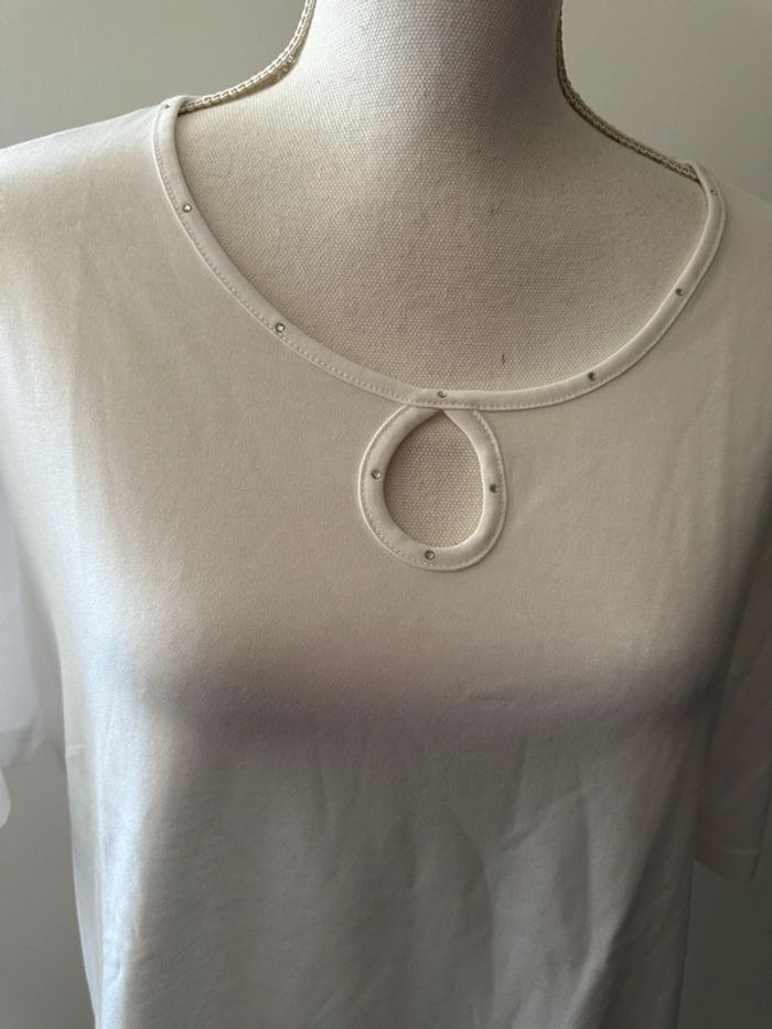 Blouse blanche à manches courtes - Excellent état - Canda - Taille L équivalent 40 - Blanche et argentée - Détail ajouré au niveau du col - Polyester et coton - Strass au niveau du col