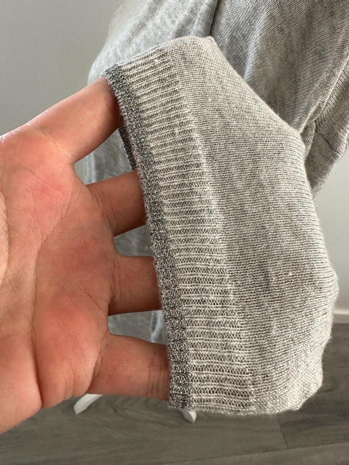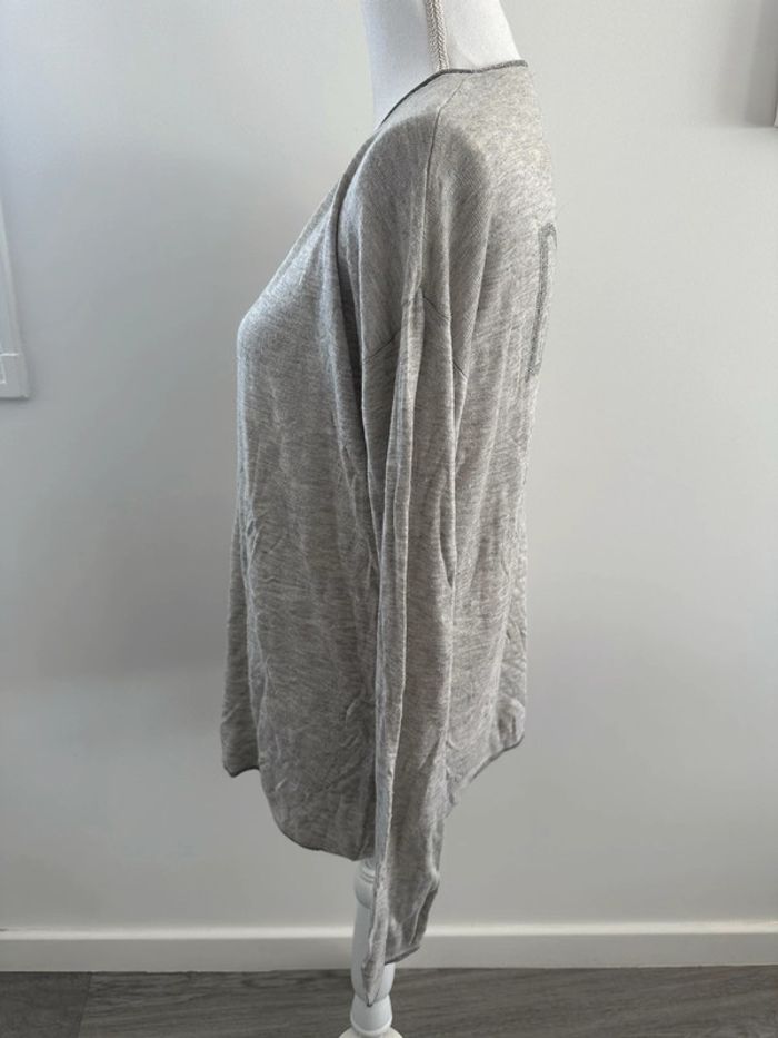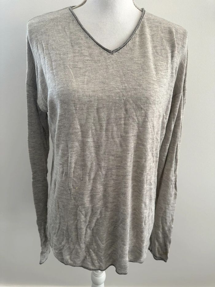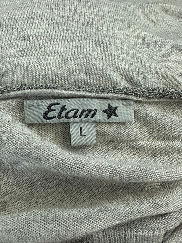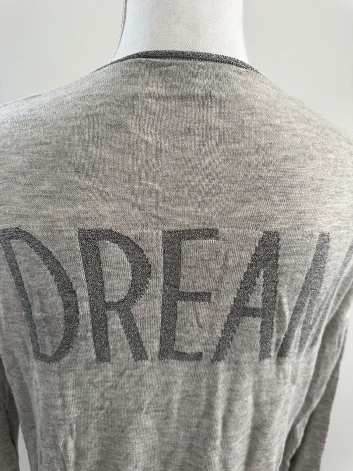 Pull fin - Excellent état - Gris et argenté - Taille 40 équivalent L - Marque Etam - Col en V - Liseré argenté aux extrémités - Inscription Dream argenté dans le dos