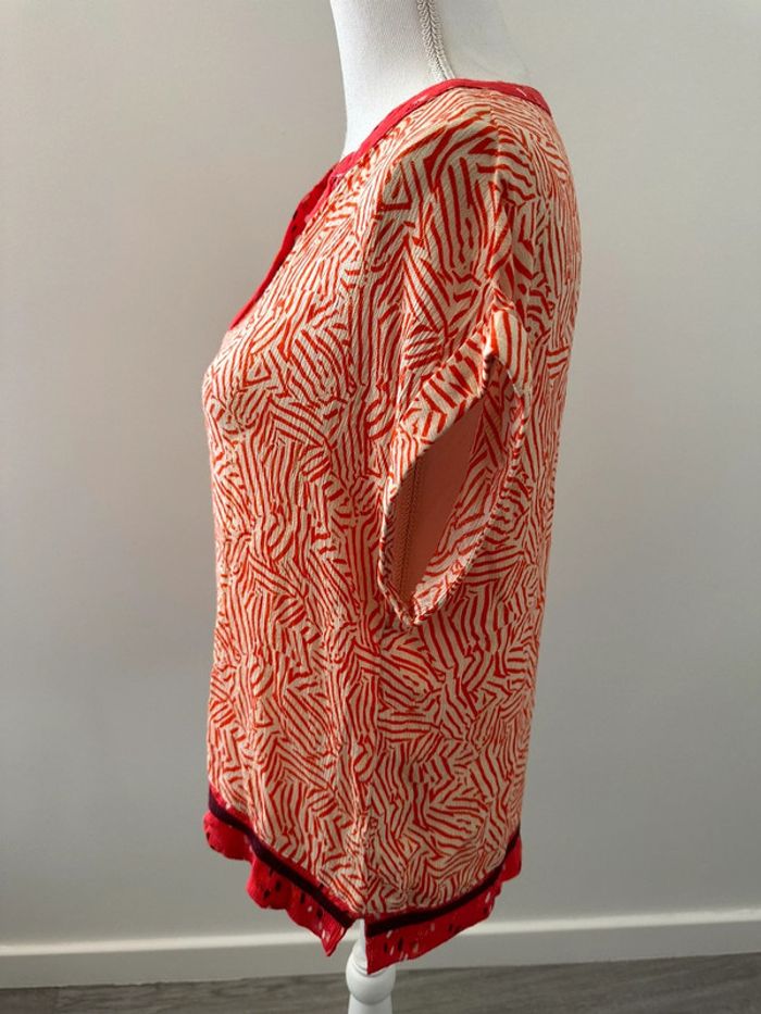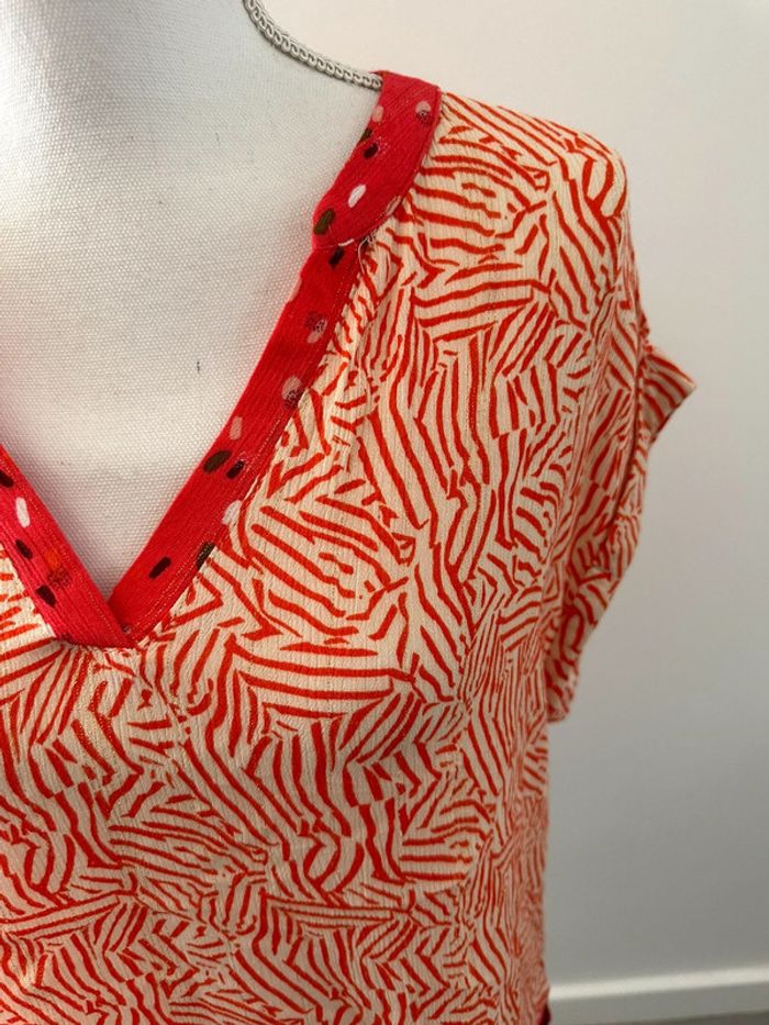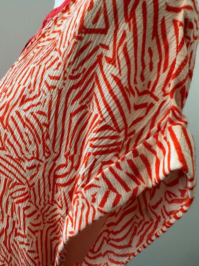 Blouse bariolée - Excellent état - Taille 38 équivalent M - Miss by Captain Tortue - Manches courtes - Orange blanche et dorée - Col en V - Viscose et fibre métallique