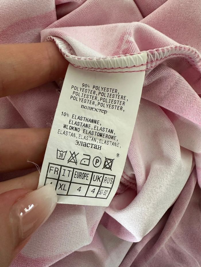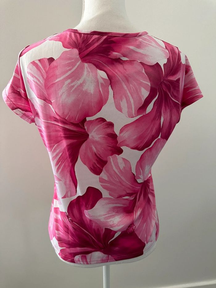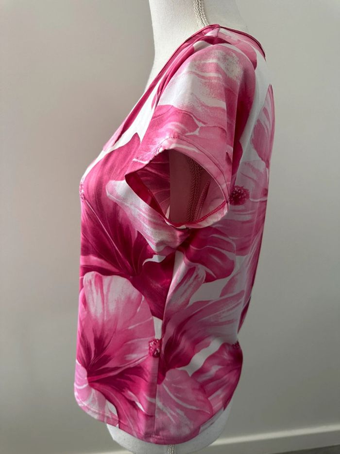T-shirt à fleurs - Excellent état - Camaïeu Vintage, années 90’ - Taille 4 équivalent 42 XL - Imprimés fleurs - Manches courtes - Matière stretch - Blanc et rose fuchsia, pastel - Col rond - Polyester et elastane