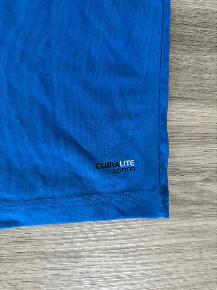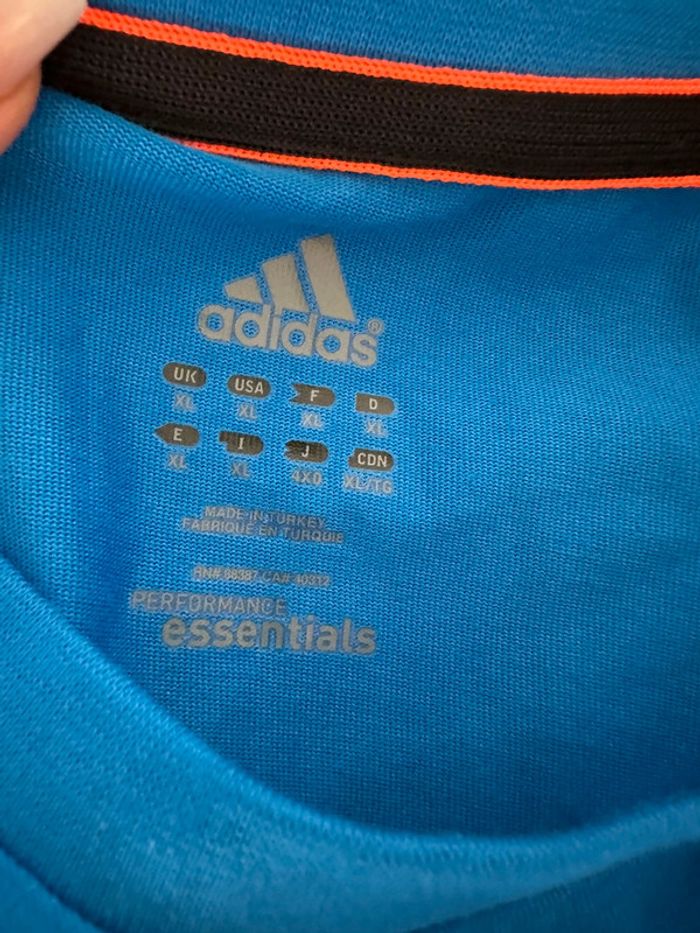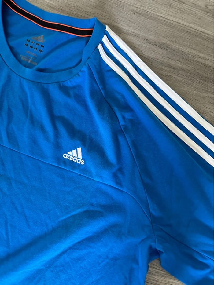 T-shirt - Excellent état - Marque Adidas - Bleu et blanc - Taille XL - Modele homme - Coton et polyester - Logo brodé - 3 bandes sur les épaules - Performance essentials - Climalite Cotton