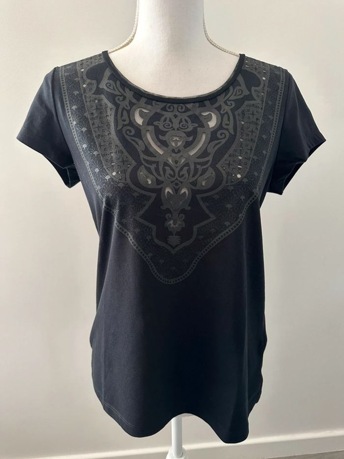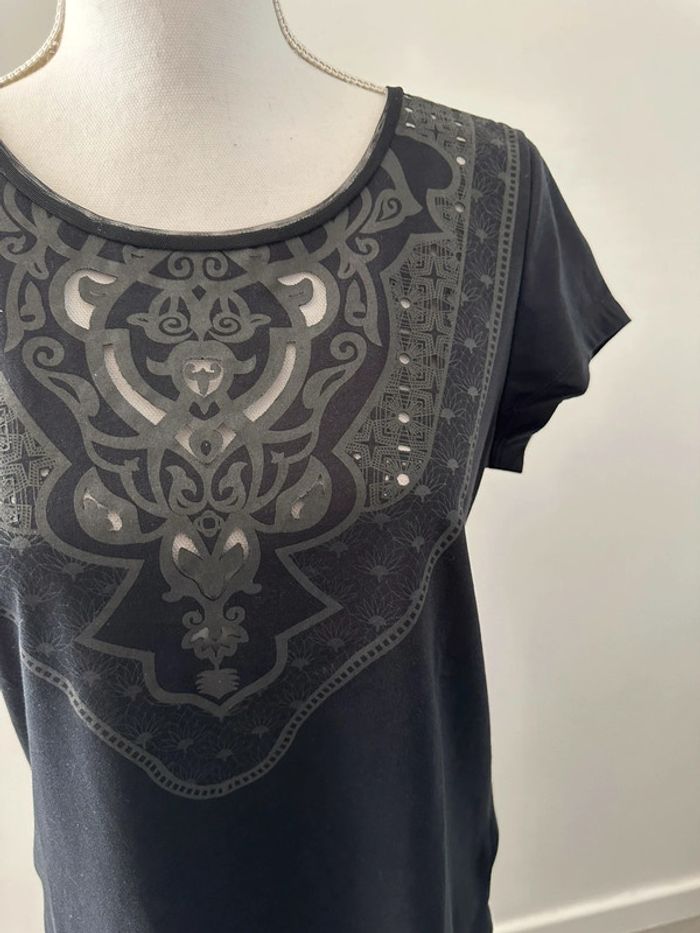 T-shirt ajouré - Excellent état - Taille 1 équivalent 36/38 - Miss Captain, Captain Tortue - Noir et gris - Manches courtes - Ajouré au niveau du col, effet broderies - Coton et polyester