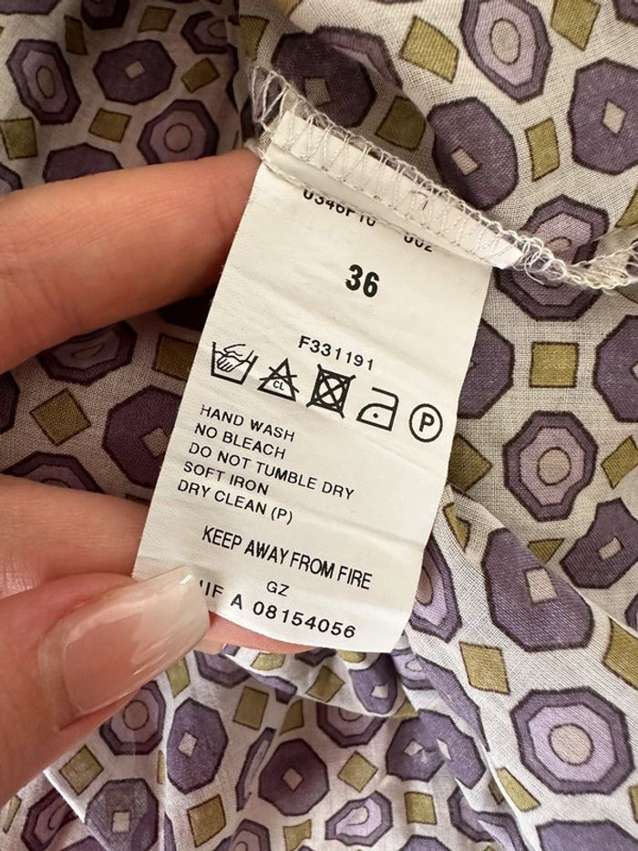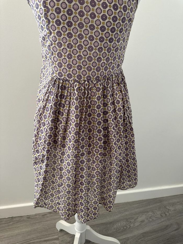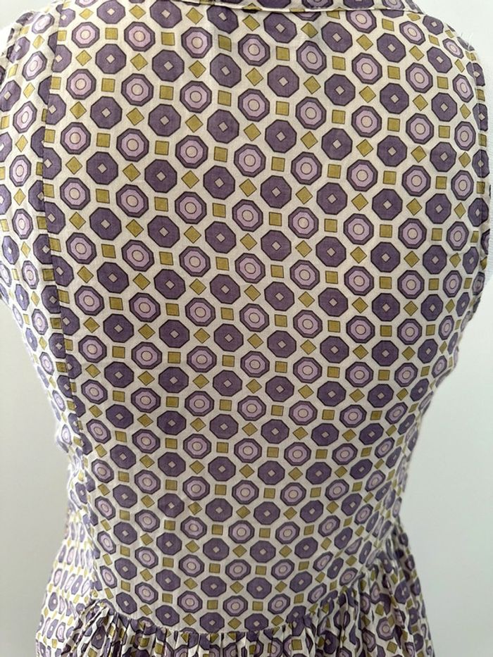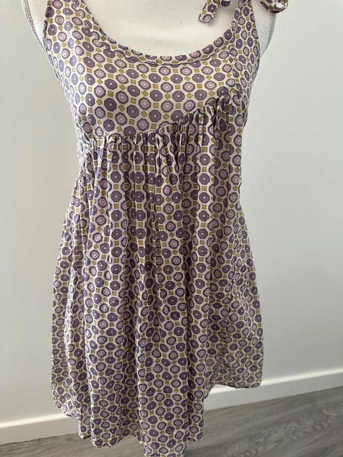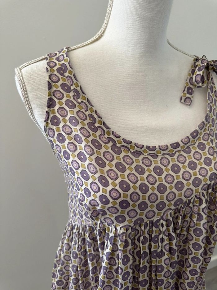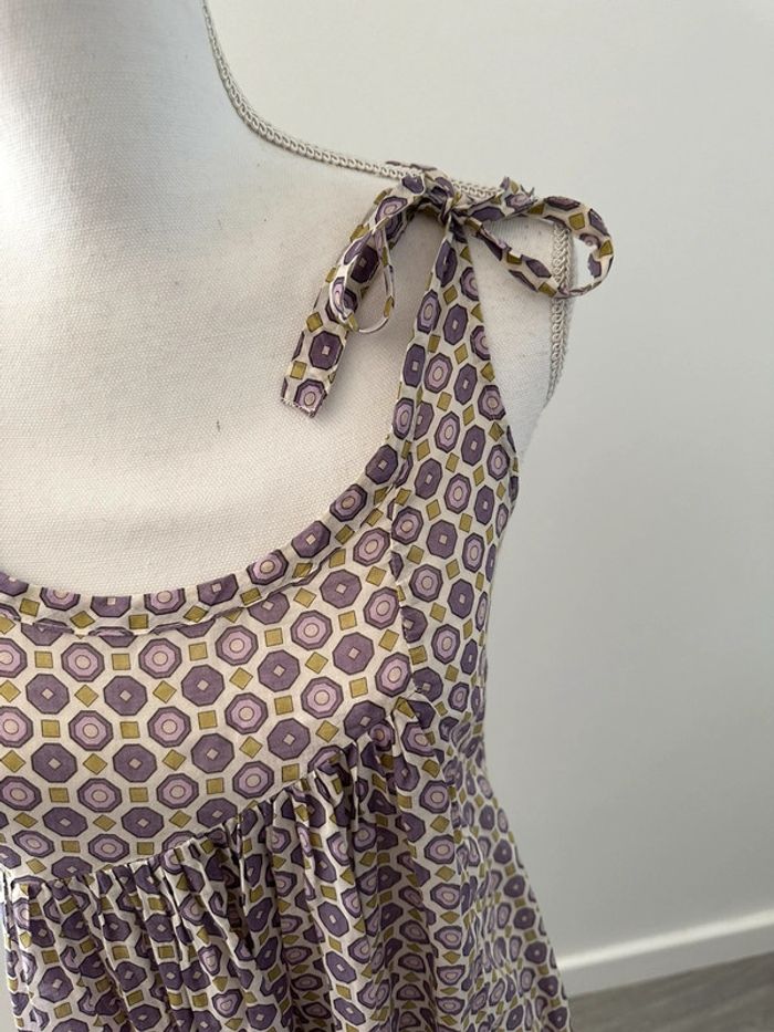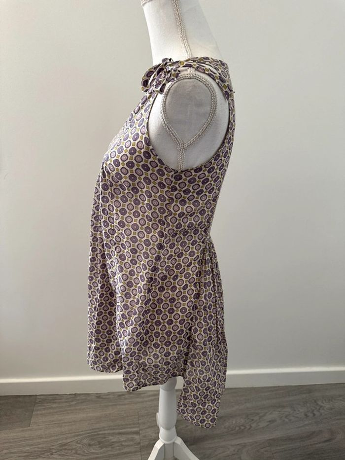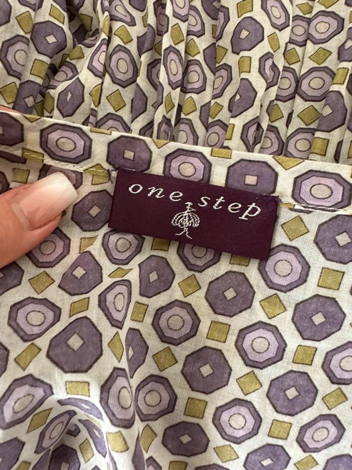 Tunique asymétrique - Excellent état - Marque One Step - Taille 36 équivalent S - 100% Coton - À nouer au niveau d’une épaule - Coupe asymétrique - Motifs géométriques - Blanche lila et verte