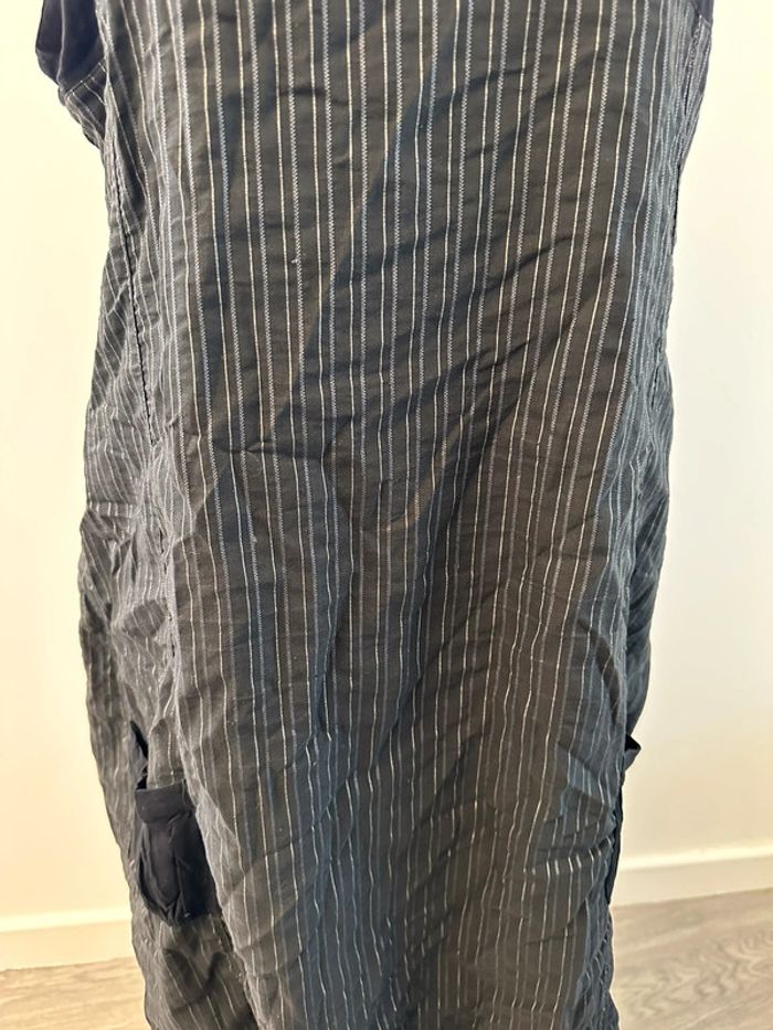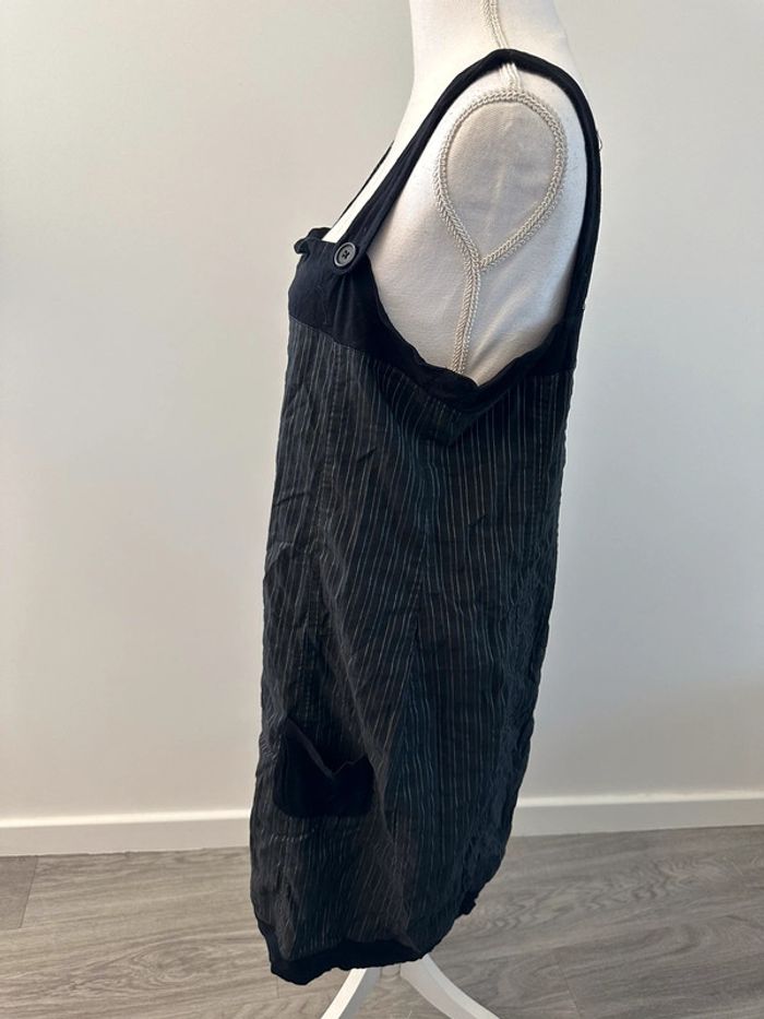 Robe à rayures - Excellent état - Marque Kiabi - Taille 46 équivalent 3XL - Noire et grise - Deux poches - Coton, polyester, viscose et elastane - Boutons décoratifs au niveau des bretelles - Tissus à rayures