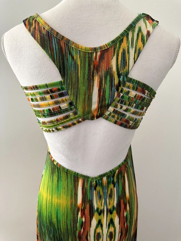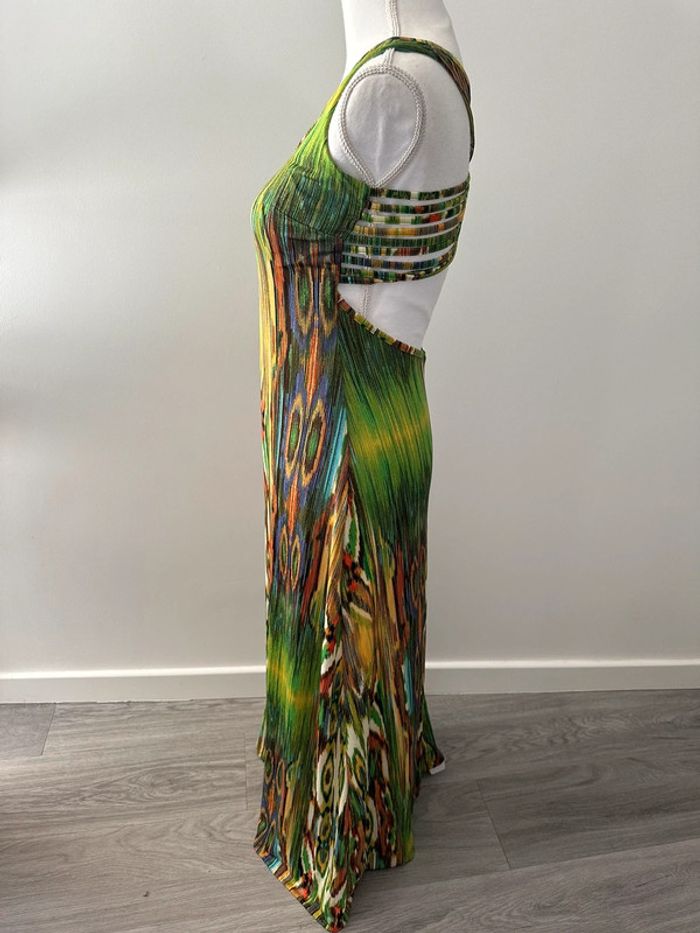 Robe longue psychédélique - Excellent état - Taille 38 équivalent M - Dans les tons verts et jaunes - Décolleté dans le dos - Imprimés psychédéliques - Tissus fluide et stretch - Plus d’étiquette de taille ni de matière