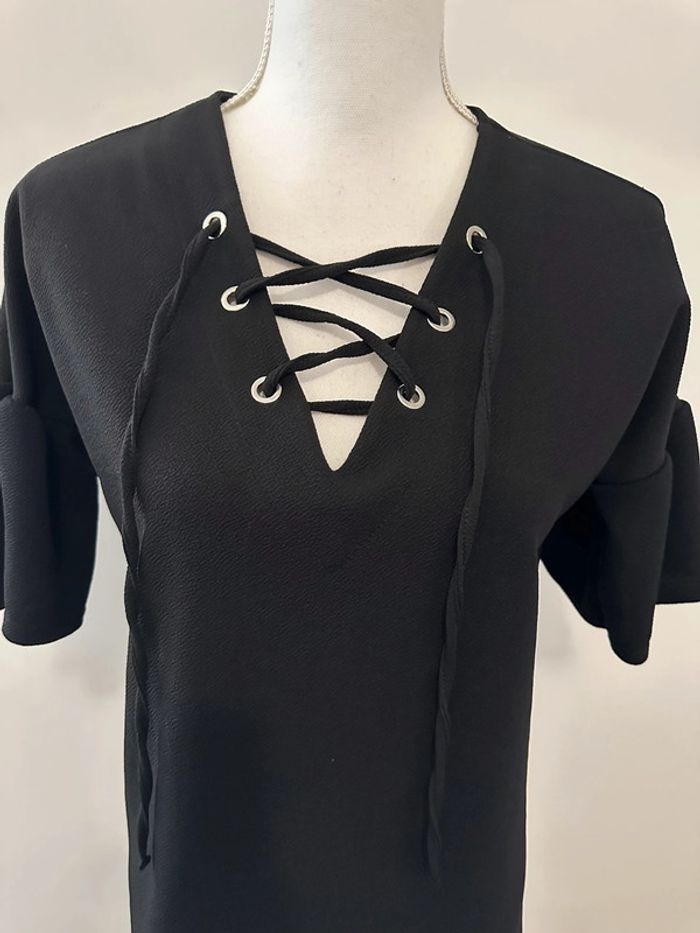 Petite robe noire - Excellent état - Taille 38 équivalent M - Manches courtes - Noire et argentée - Œillets argentés au niveau du décolleté - Plus d’étiquette de matière - Marque Jennyfer