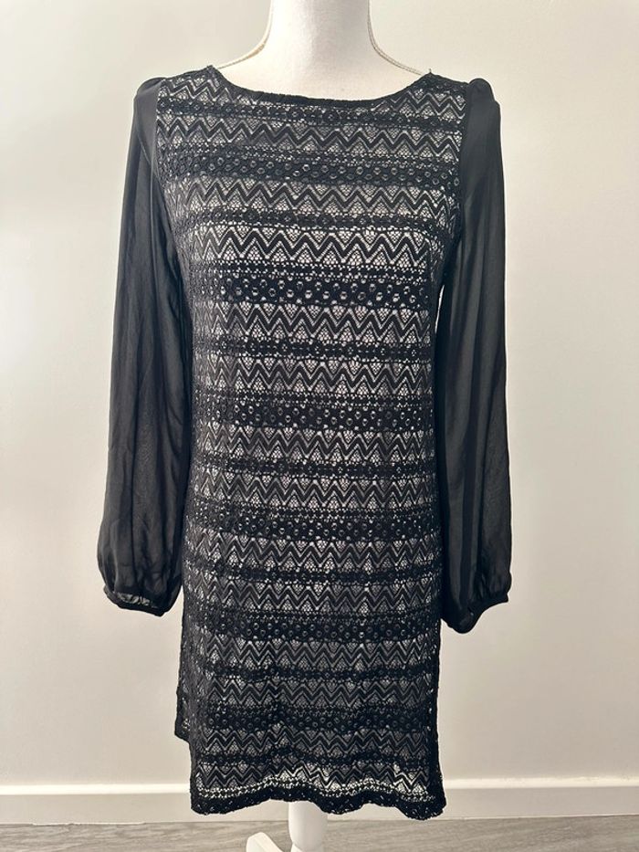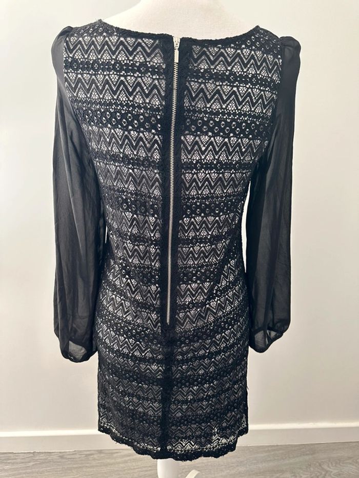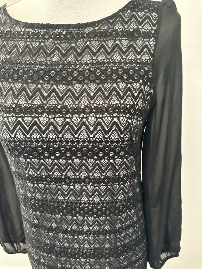 Petite robe noire en dentelle - Excellent état - Taille 36 équivalent S - Marque Promod - Zip dans le dos - Doublure intérieure blanche satinée - 100% polyester - Manches longues en voile