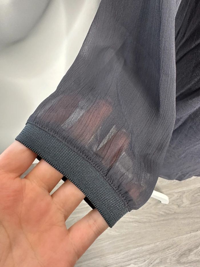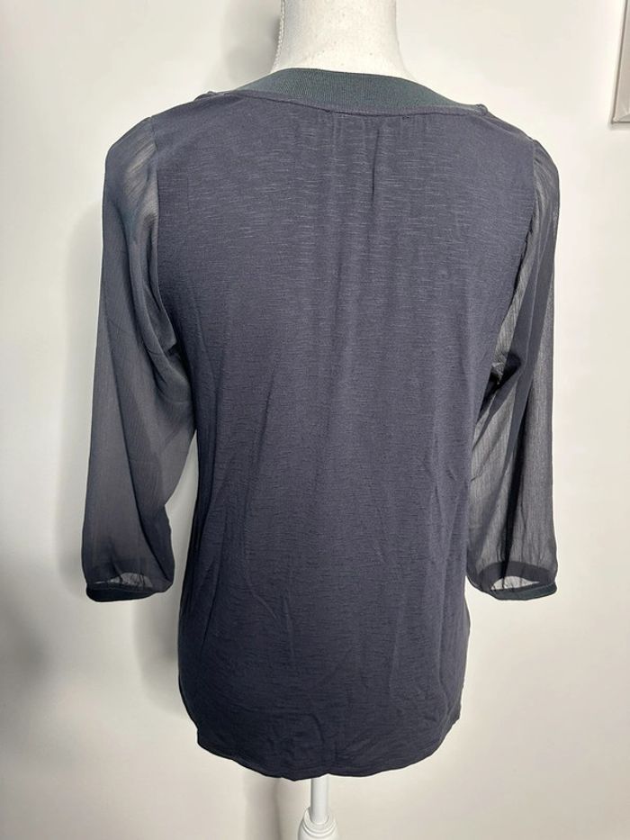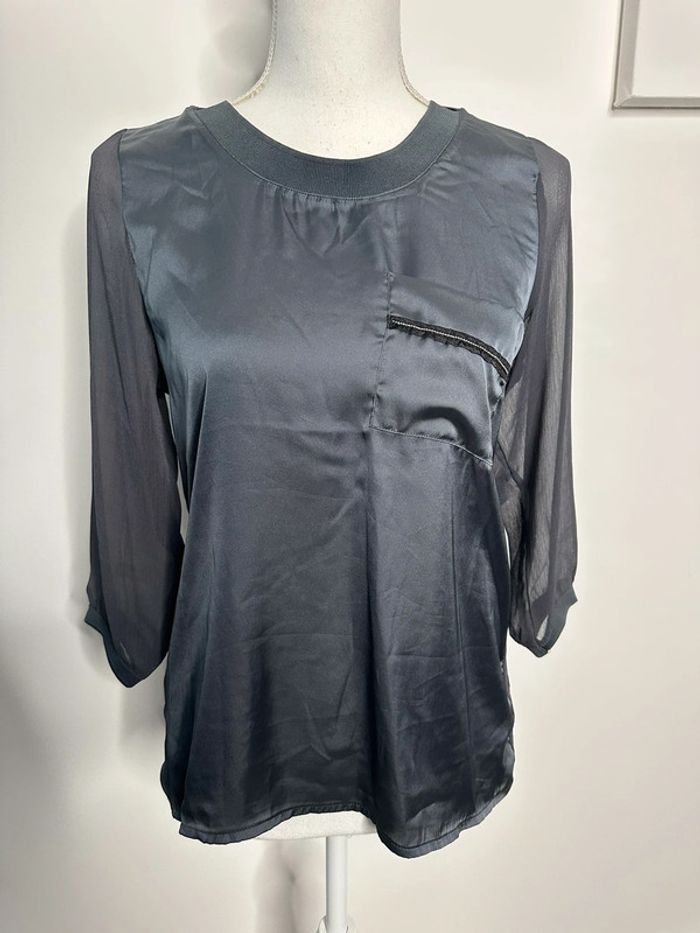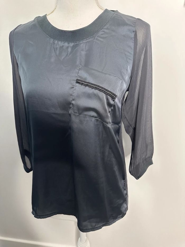 Blouse grise argentée satinée - Excellent état - Trend by Captain Tortue - Taille 0 équivalent 34 XS - Grise et argentée - Tissus satiné - Manches en voile mesh 3/4 - Polyester, viscose et elastane