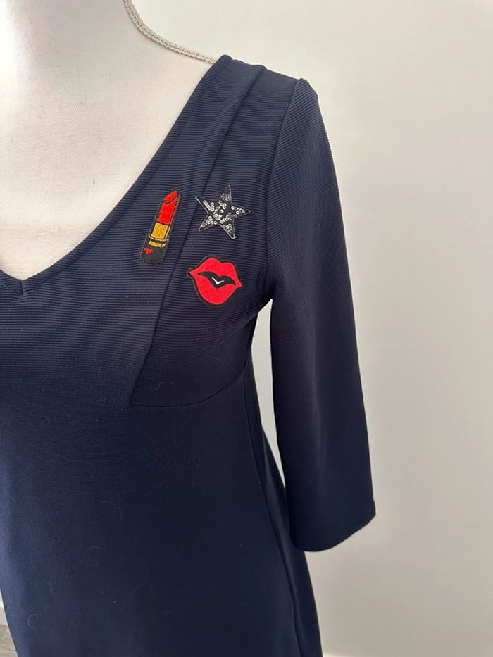 Robe bleue marine et rouge - Excellent état - Taille 38 équivalent M - Grain de Malice GDM - Col en V - Manches 3/4 - Écussons patchs rouges, rouge à lèvres, étoile, bisou - Plus d’étiquette de matière