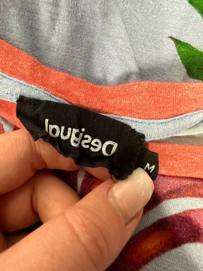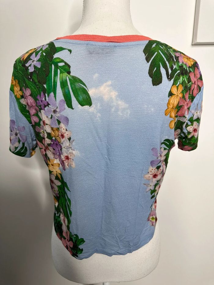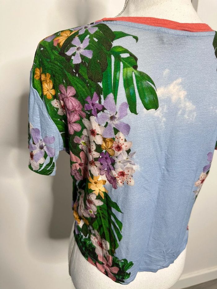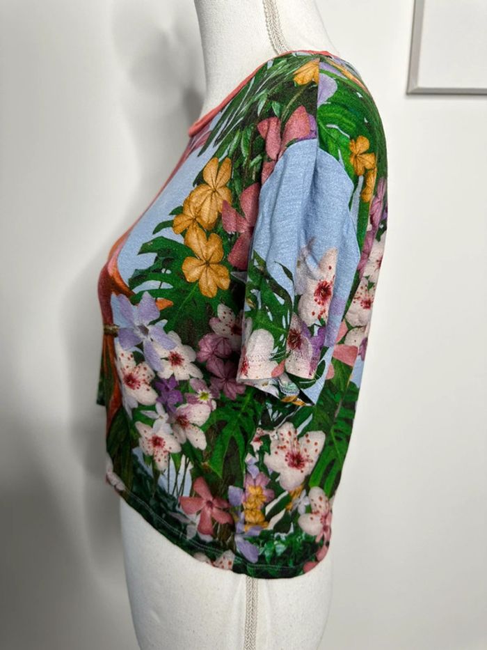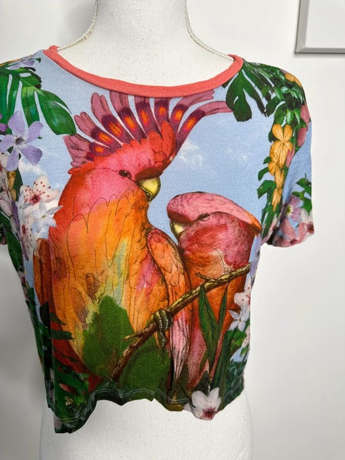 T-shirt crop top - Excellent état - Multicolore - Imprimés perroquets - Marque Desigual - Taille M équivalent 38 - Viscose et Lin - Encore disponible sur le site de Desigual au prix de 49,95€