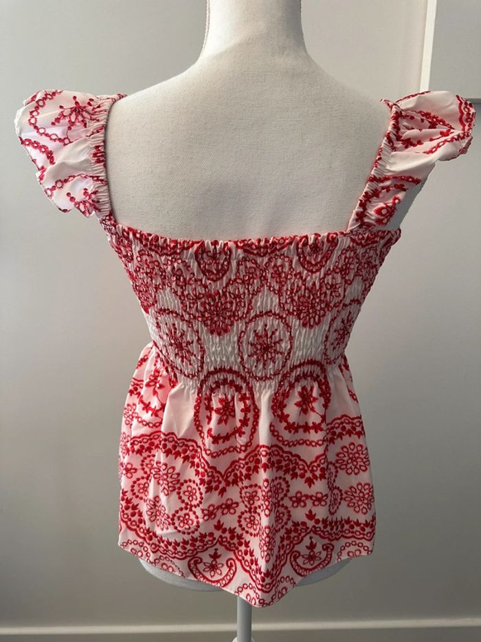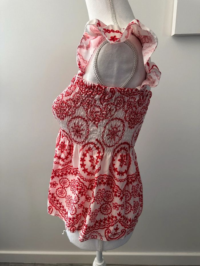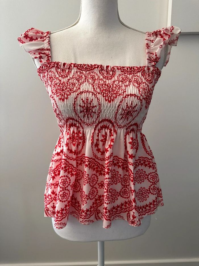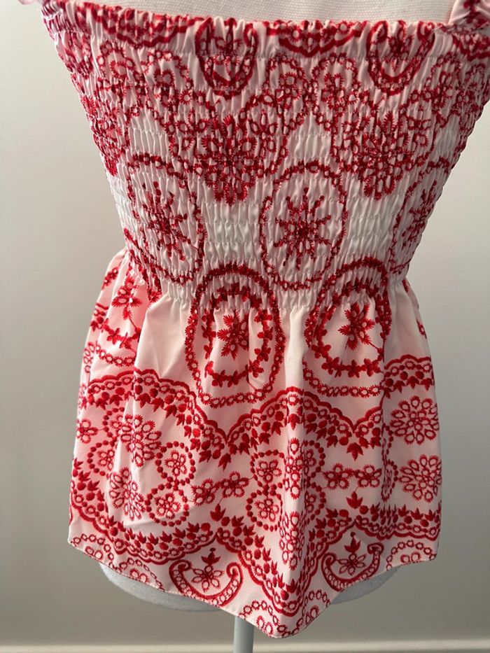 Crop top - Excellent état - Blanc et rouge - Élastique au niveau de la poitrine et des bretelles - Fabriquée en Italie 🇮🇹 - Polyester et elastane - Imprimé rouge façon broderies - Style bohème chic vintage - Pas d’étiquette de taille