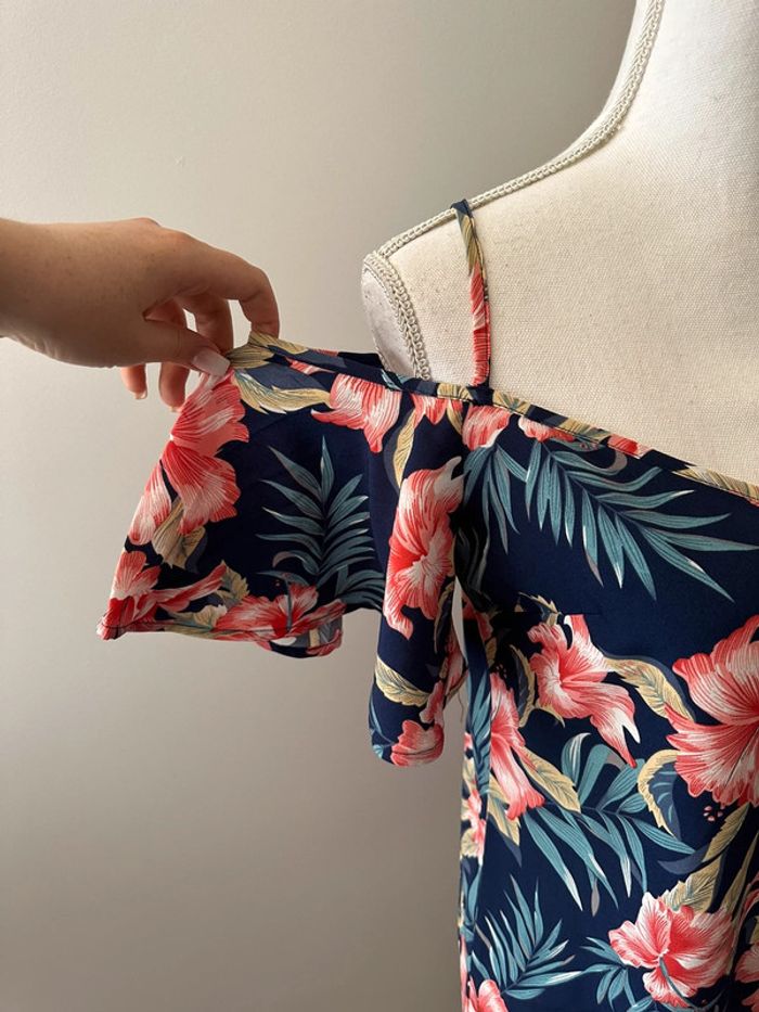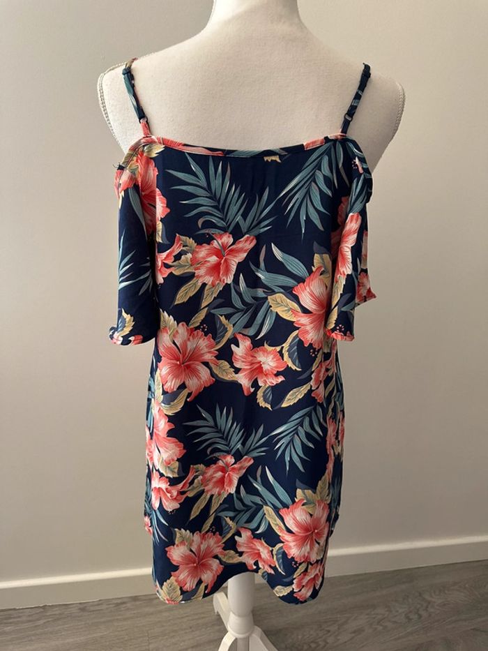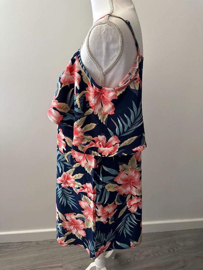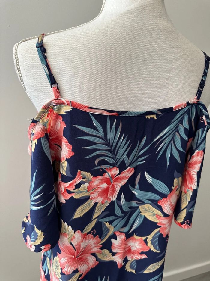 Robe fleurs tropicales - Excellent état - Taille 38 équivalent M - Bleue marine et rose - Fines bretelles réglables - Epaules dénudées et petites manches - Tissus fluide - Plus d’étiquette de taille ni de matière