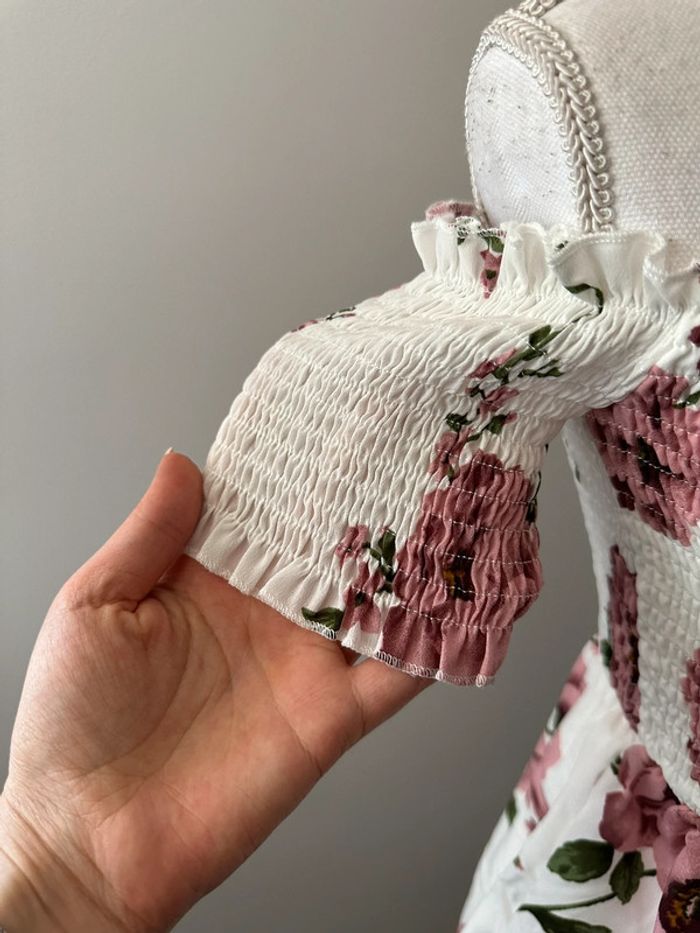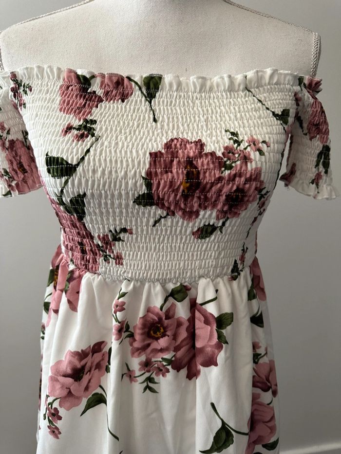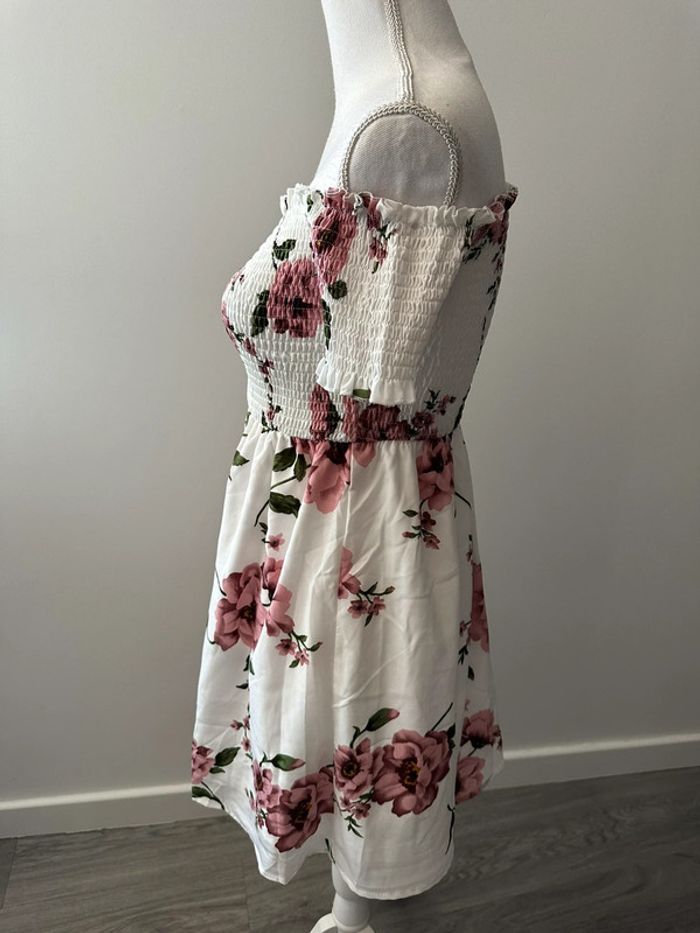 Robe à fleurs - Excellent état - Blanche et rose - Taille 38 équivalent M - Epaules dénudées - Élastique au niveau du buste et des manches - Manches courtes - Doublure intérieure - 100% polyester - Plus d’étiquette de taille