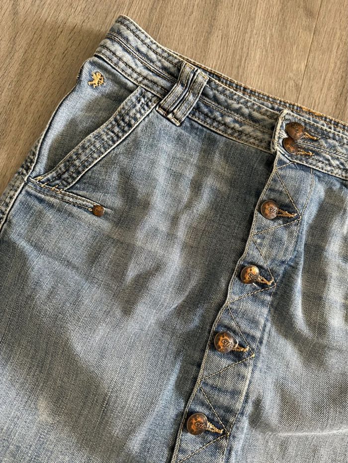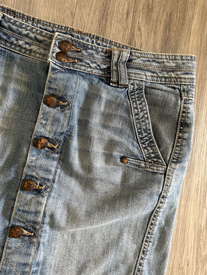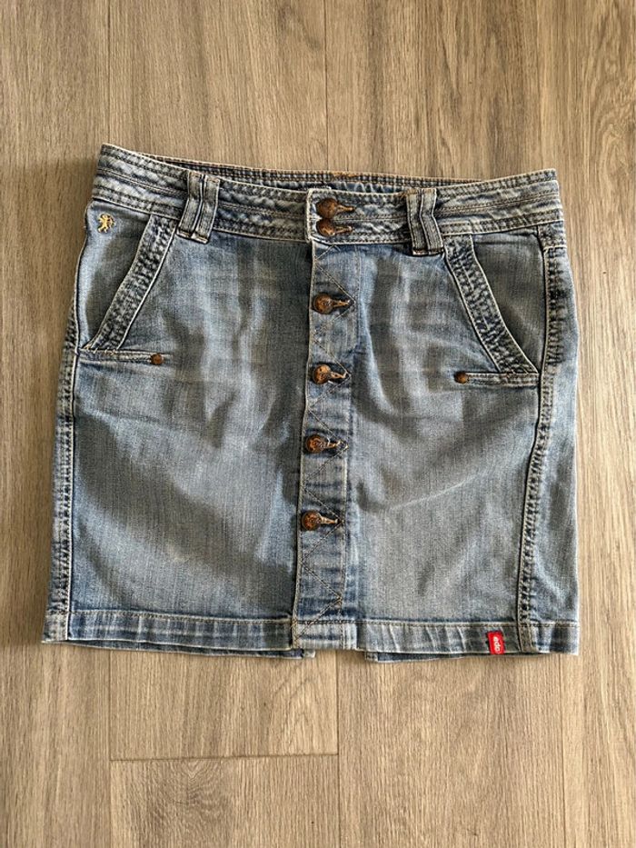Jupe en jean - Excellent état - EDC by Esprit - Taille 36 équivalent S - Se ferme avec des boutons - Deux poches à l’avant, deux poches à l’arrière - Bleu délavé - Plus d’étiquette de matière - Tissus stretch Dimensions: - 36 à 42cm à la taille - 43cm de long