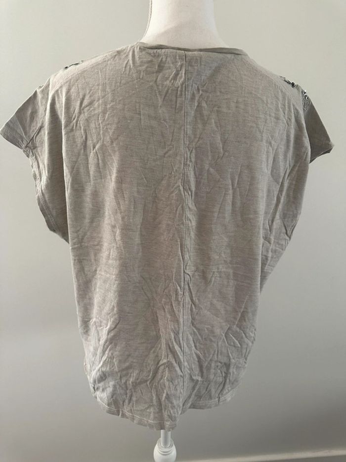 T-shirt crème et sequins dorés argentés - Excellent état - Taille 42/44 équivalent XL/XXL - Marque Kiabi - Coton et acrylique - Manches courtes - Sequins dorés et argentés au niveau des épaules en forme de fleurs