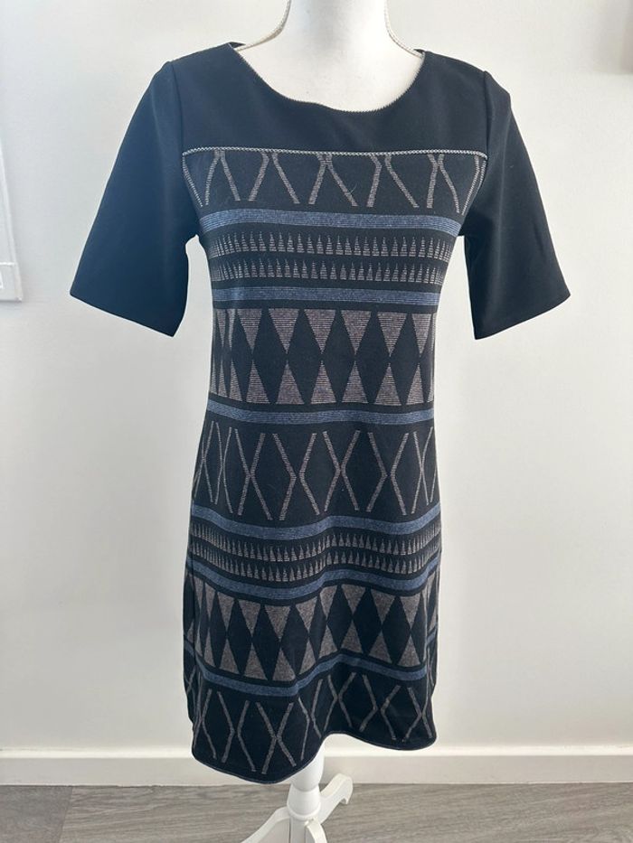 Robe ethnique aztèque - Excellent état - Taille 38 équivalent M - Bleu marine et grise - Manches courtes - Polyester et coton - Imprimés aztèques ethniques