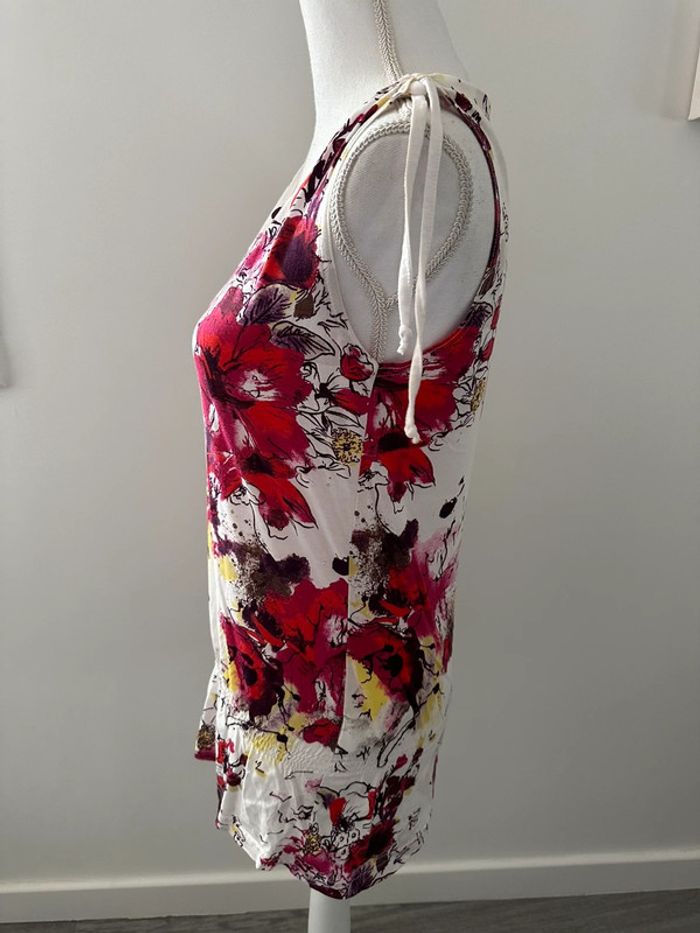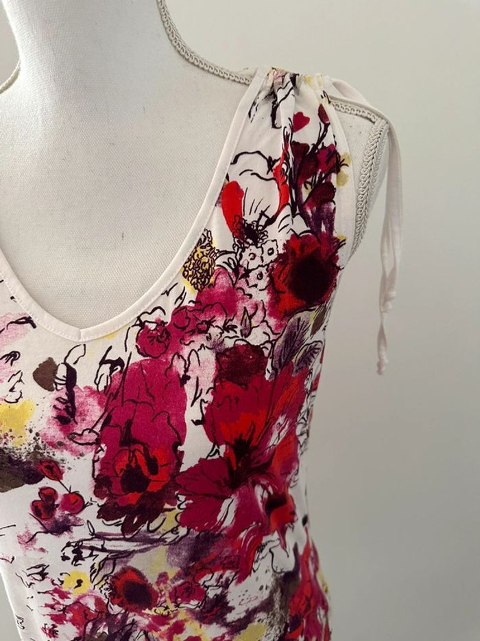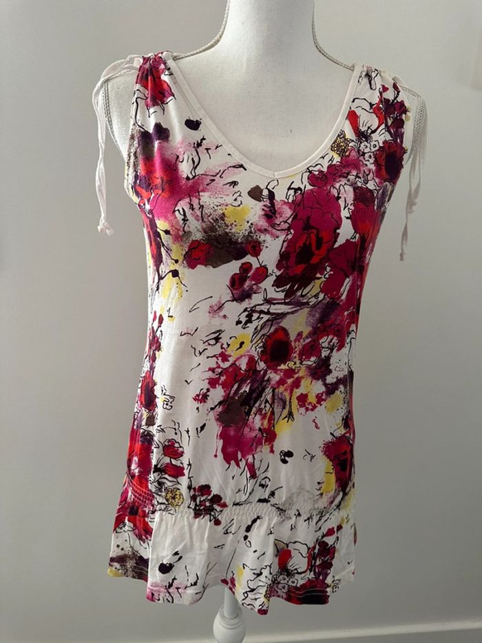 Tunique à fleurs - Excellent état - Street One - Taille 38 équivalent M - Lien à nouer au niveau des épaules - Motifs fleurs pastel aquarelle - Blanche rouge et rose avec des touches de jaune - 100% coton - Petit volant sur le bas de la tunique