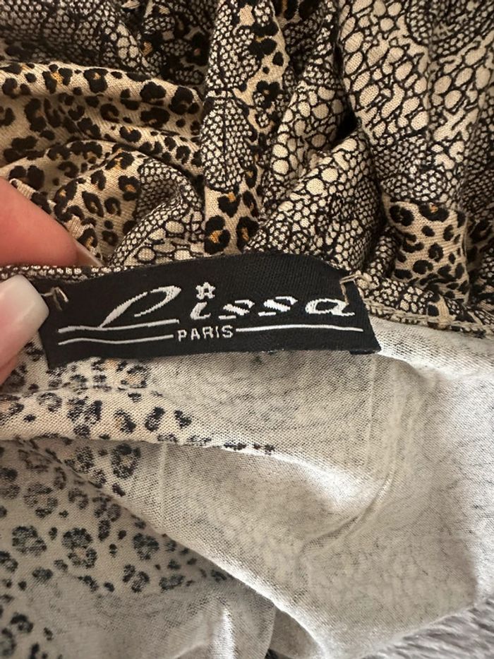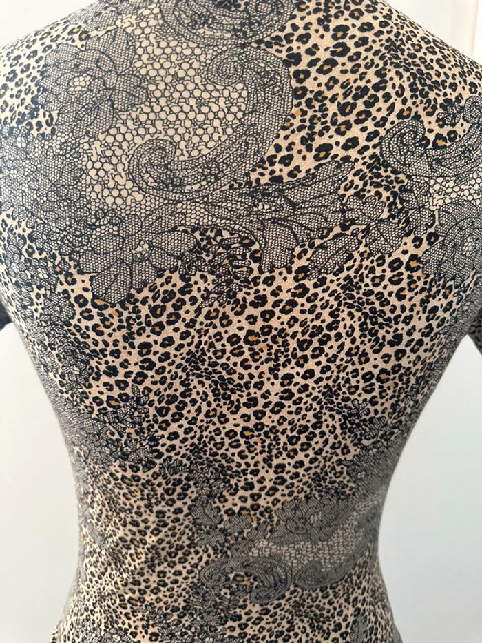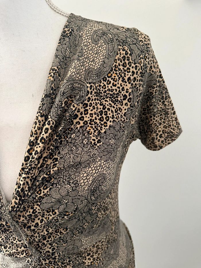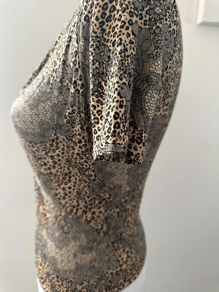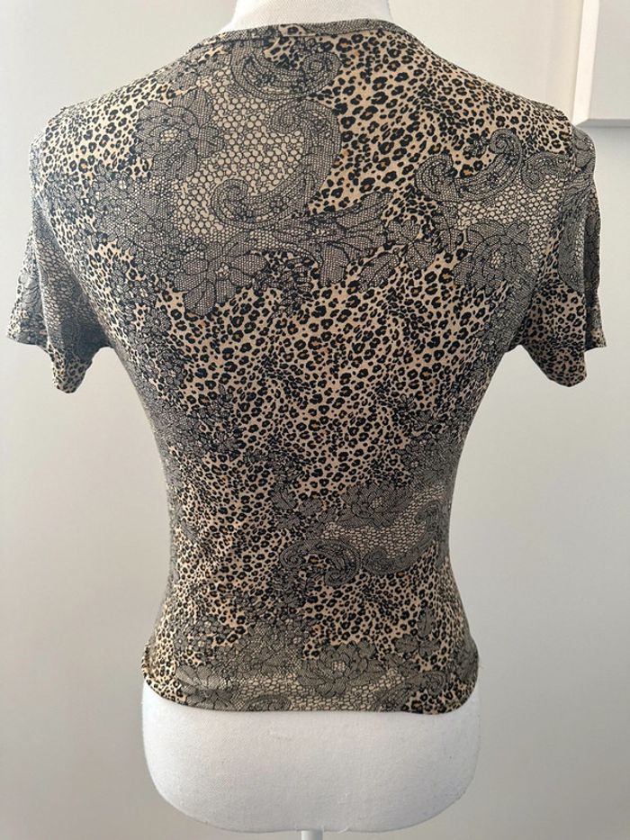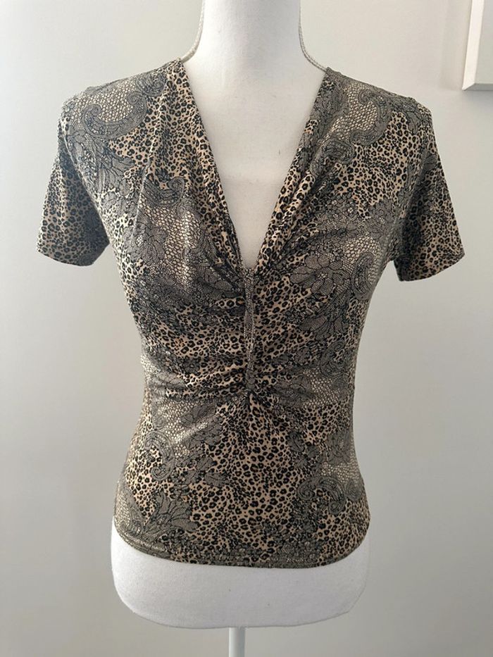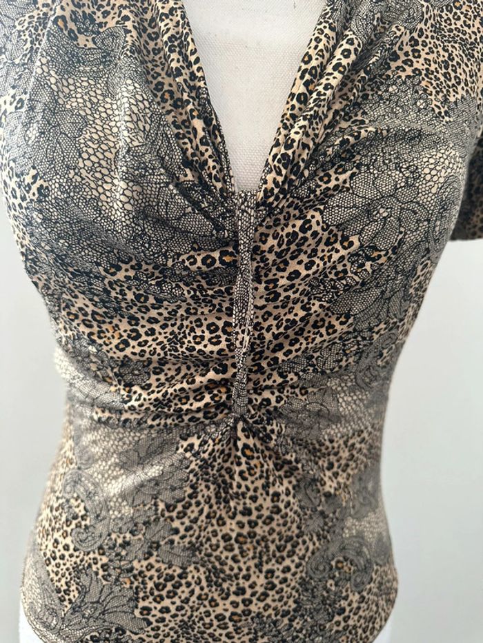 Crop top - Excellent état - Imprimés dentelle et léopard - Taille 38 équivalent M - Décolleté en V - Beige et marron - Manches courtes - Tissus stretch - Coupe moulante - Vintage années 90’