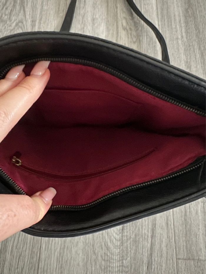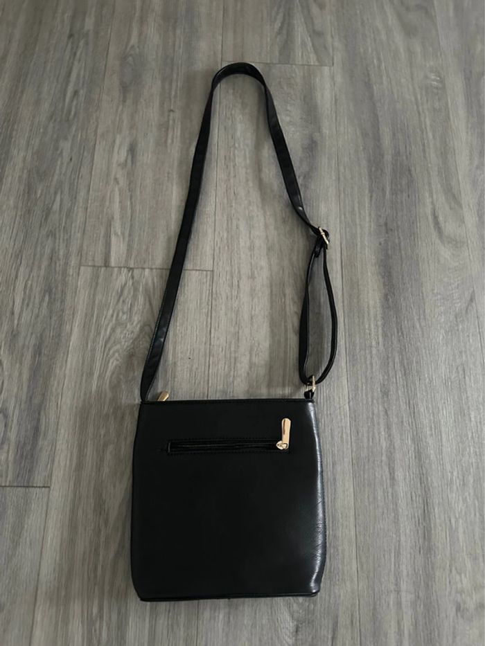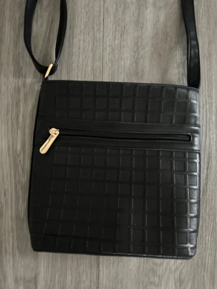 Sac bandoulière - Excellent état - Noir et doré - Bandoulière réglable - Se ferme avec un zip - Intérieur en tissus bordeaux - Simili cuir - Face à carreaux quadrillé Dimensions: - 25cm de large - 24cm de haut - 5,5cm de profondeur