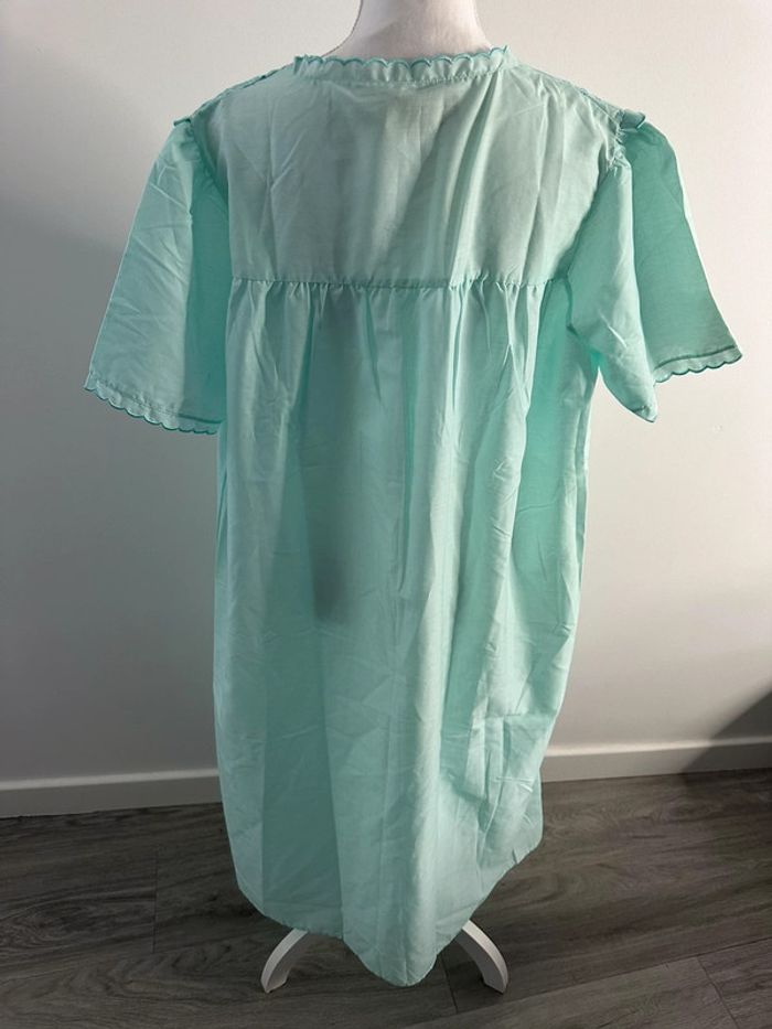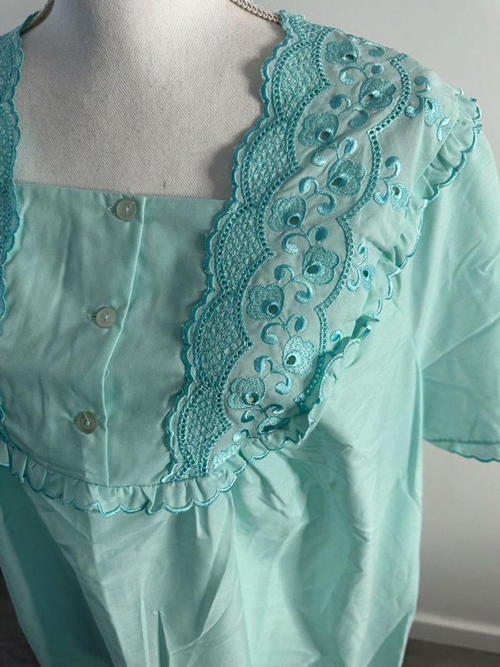 Chemise de nuit brodée - Excellent état - Taille 52/54 équivalent 6XL/7XL - Couleur vert menthe - Détails brodés au niveau du col - Manches courtes - Polyester et coton - Vintage années 90’