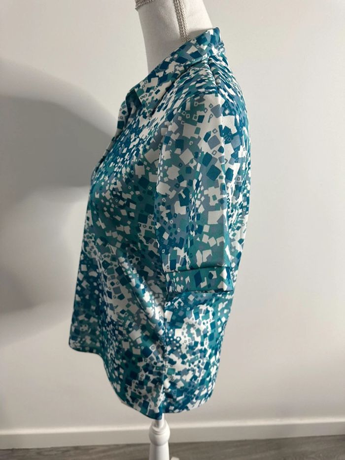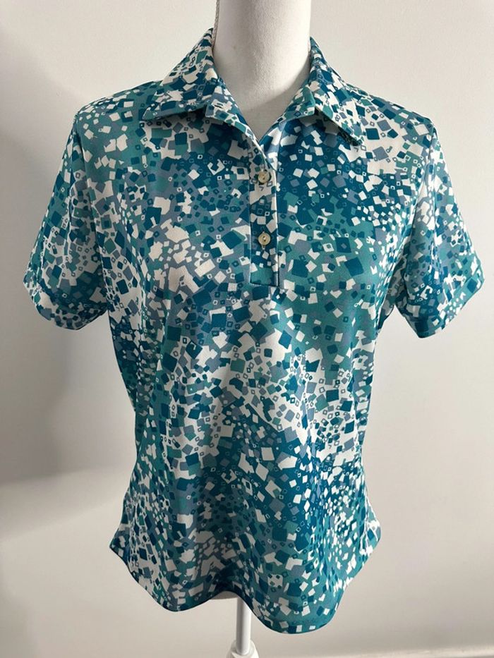Polo bleu psychédélique - Excellent état - Dans les tons bleus et blanc - Manches courtes - Boutons au niveau du col - Taille 38 équivalent M - Fabrication française 🇫🇷 - 100% polyester - Motifs carrés psychédéliques