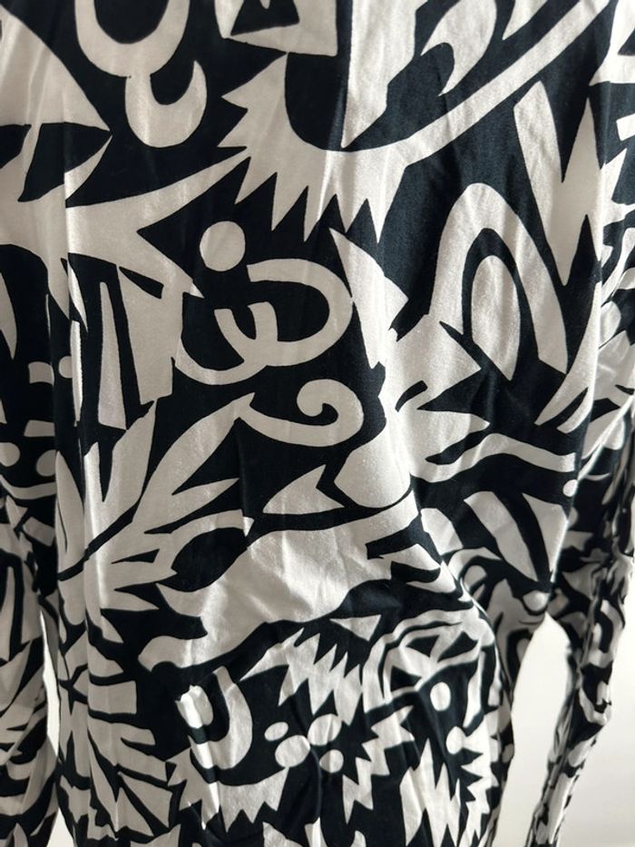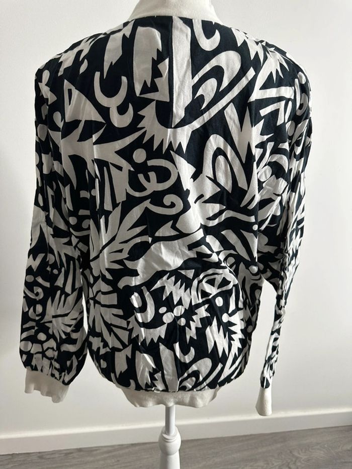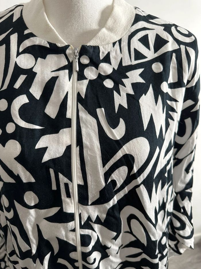 Bomber fin bariolé - Excellent état - Noir et blanc - Se ferme avec un zip - Taille 40 équivalent L - Se ferme avec un zip - Deux poches - Fabrication allemande - Motifs imprimés bariolés - Vintage années 80-90 - Ancien logo de la marque