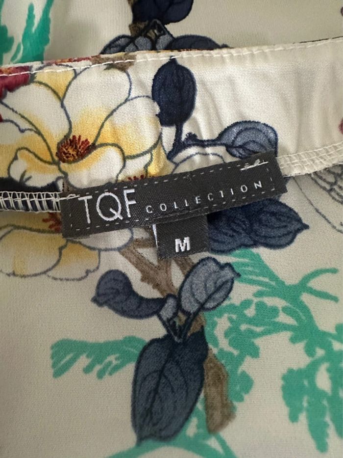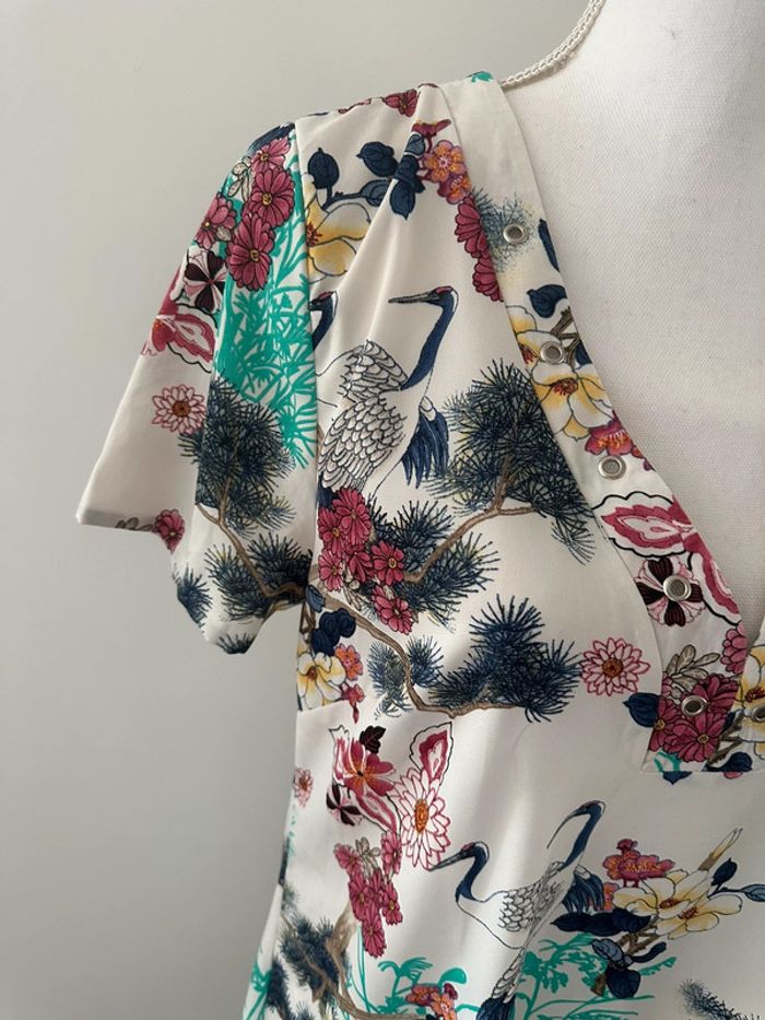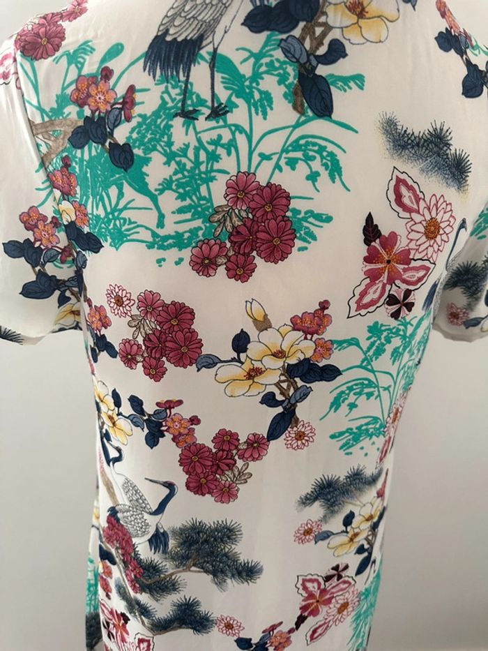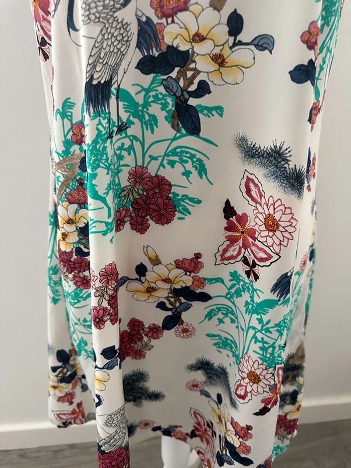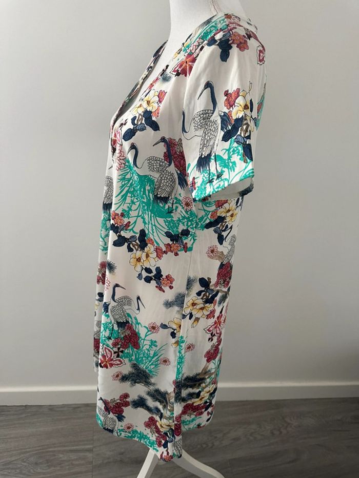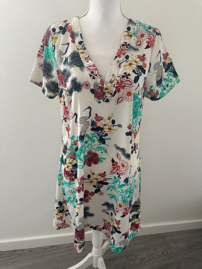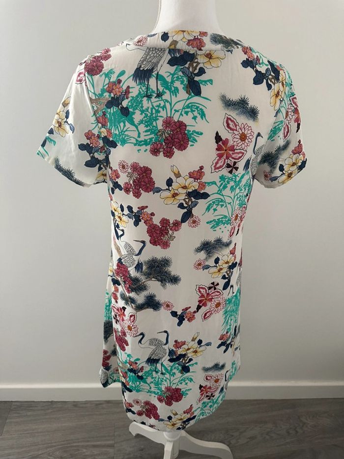 Robe à fleurs - Excellent état - Blanche et multicolore - Taille M équivalent 38 - Manches courtes - Motifs fleurs et oiseaux