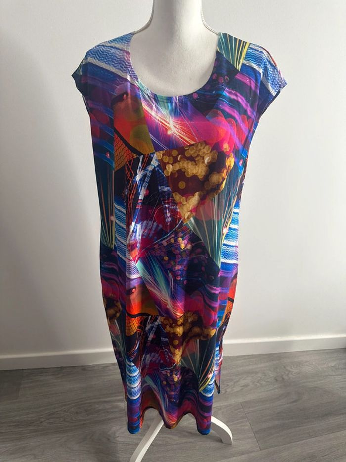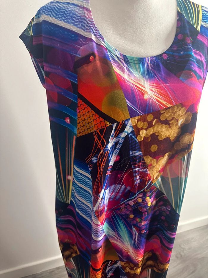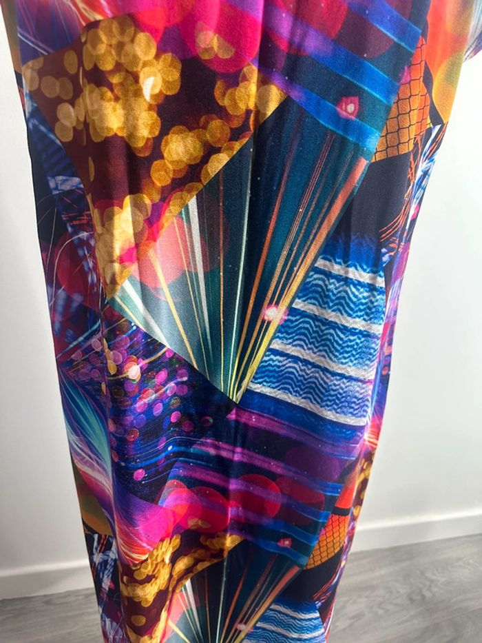 Robe bariolée multicolore - Excellent état - Taille 48 equivalent 4XL - Multicolore - Manches courtes - Légèrement fendue sur un côté - Matière ultra stretch Dimensions: - 55cm de aisselle à aisselle - 110cm de long