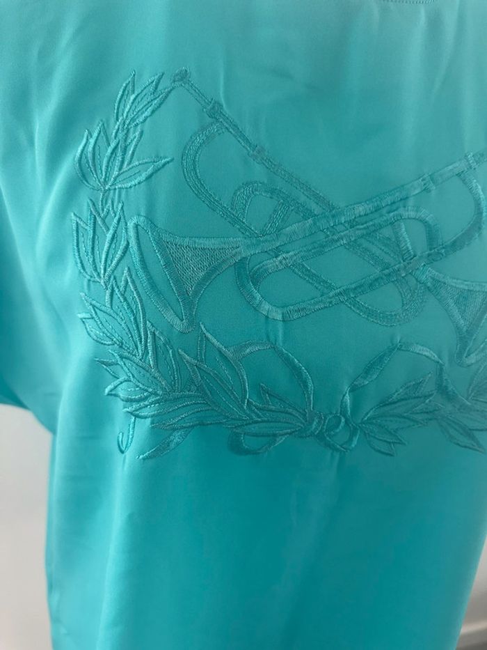 Blouse brodée - Bleue - Excellent état - Manches courtes - Taille 42 equivalent XL - 100% Polyester - Broderies trompette rameaux d’olivier - Vintage, années 90’