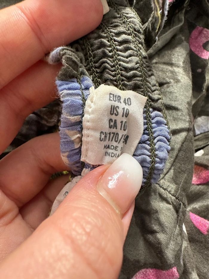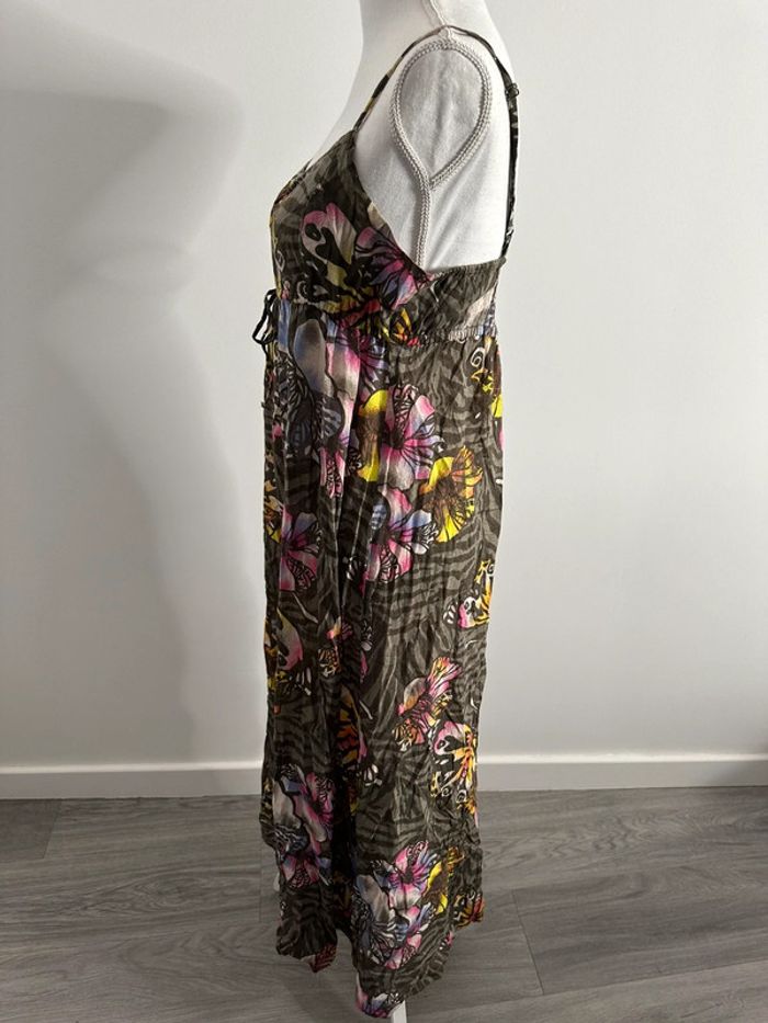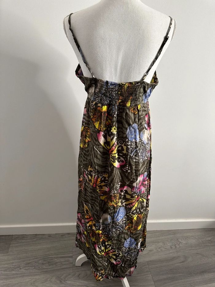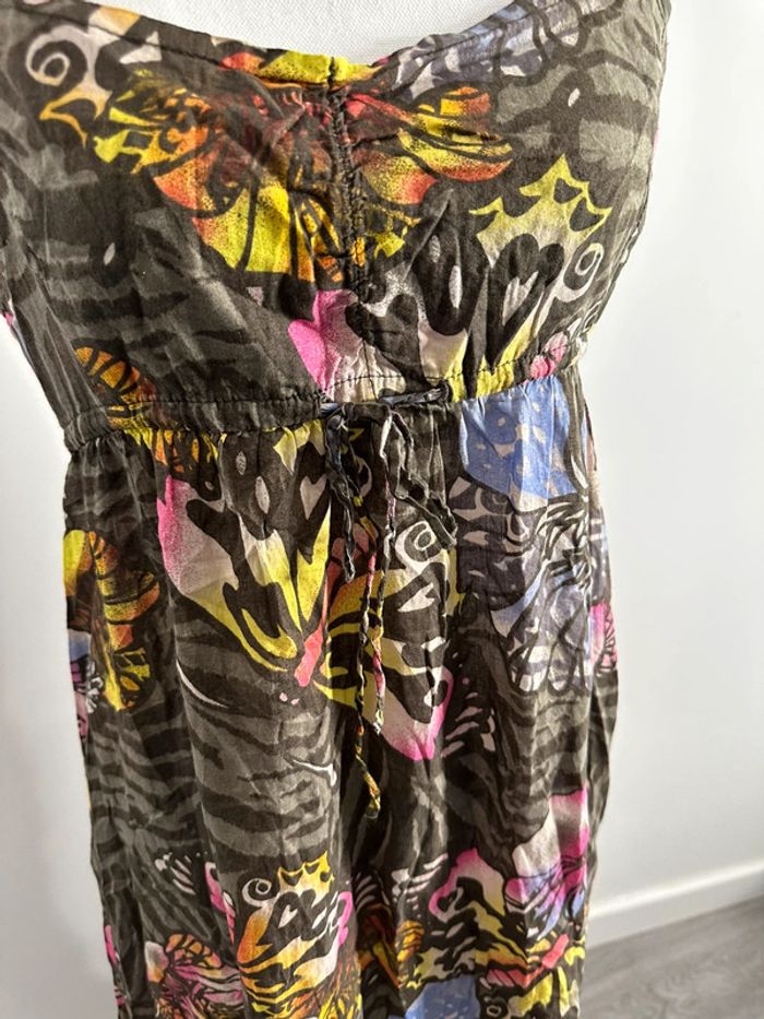 Robe longue - Excellent état - H&M - Taille 40 equivalent L - Marron et multicolore - Motifs papillons - Ajustable sous la poitrine - Bande élastique dans le dos - Bretelles réglables