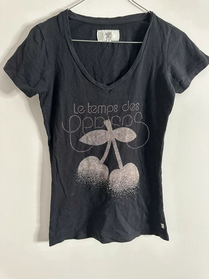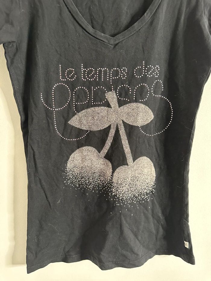 T-shirt noir et argenté - Excellent état - Le Temps des cerises - Taille S équivalent 36 - Strass argentés - Imprimé Cerise