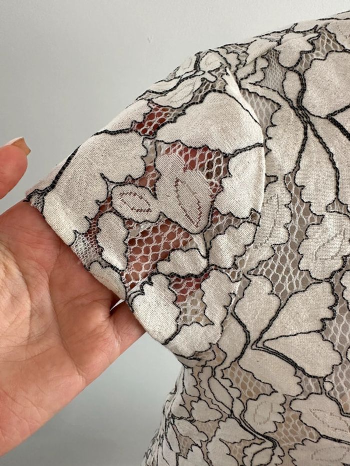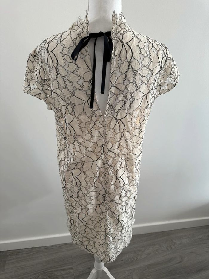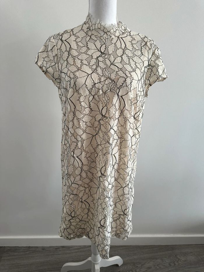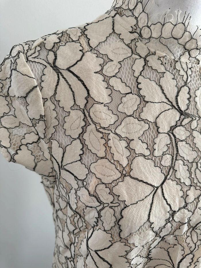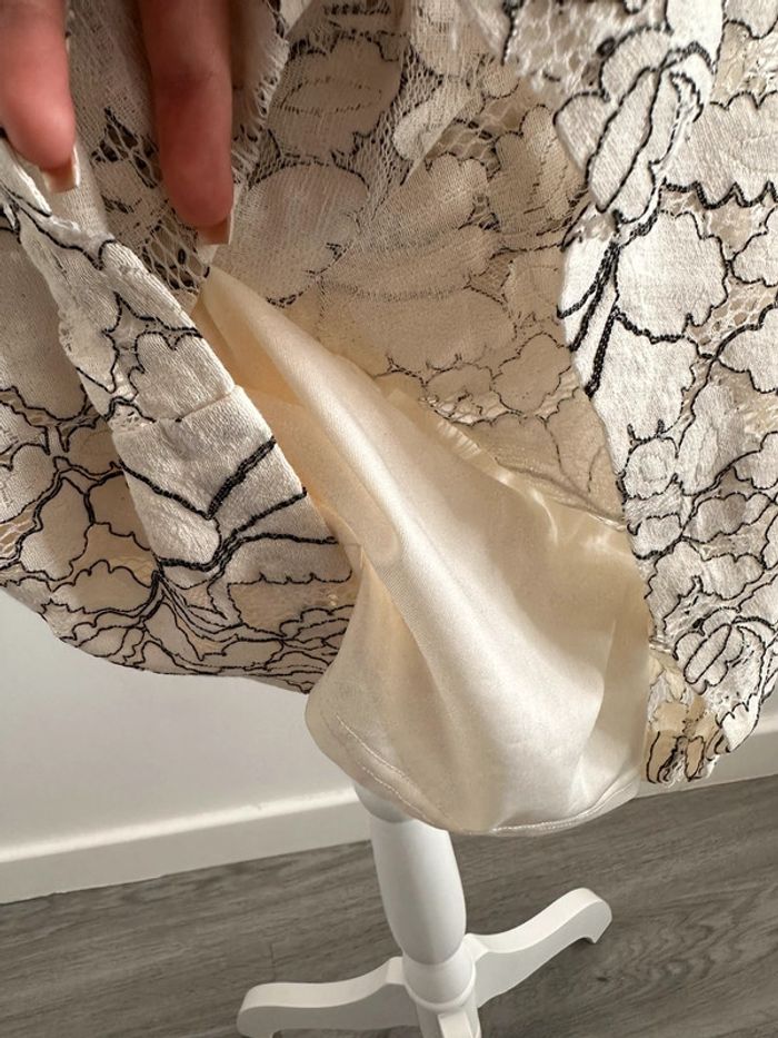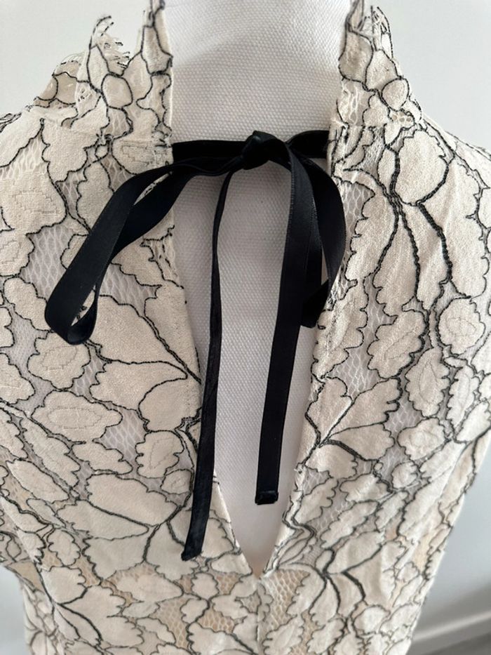 Robe broderies fleurs - Excellent état - Taille 40 équivalent L - Beige crème et noire - Lien à nouer dans la nuque - Doublure intérieure - Coton, polyamide et polyester
