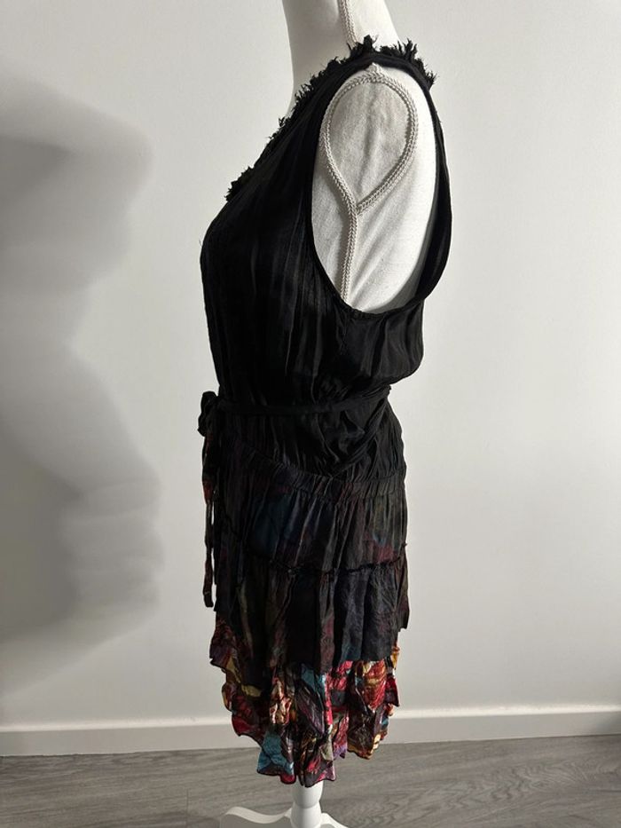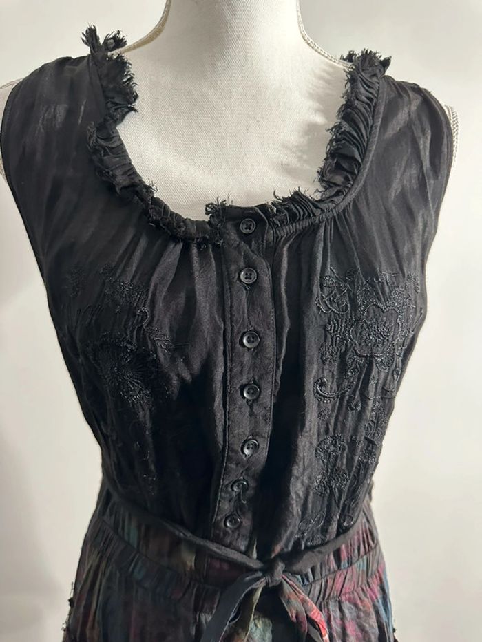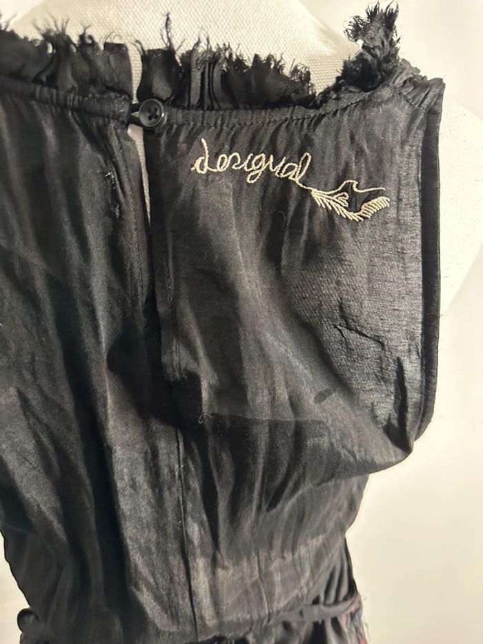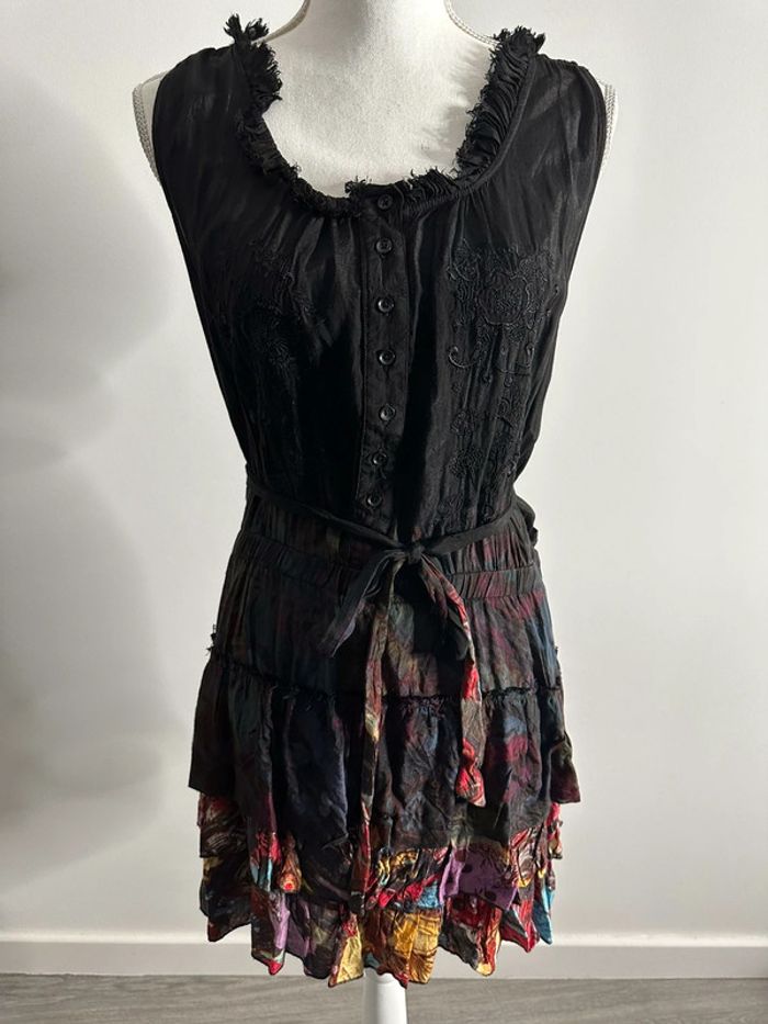 Robe à fleurs - Excellent état - Noire et multicolore - Marque Desigual - Taille 38 équivalent M - Broderies, boutons et volants - Ceinture à la taille