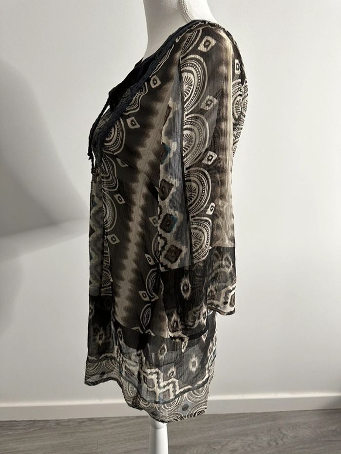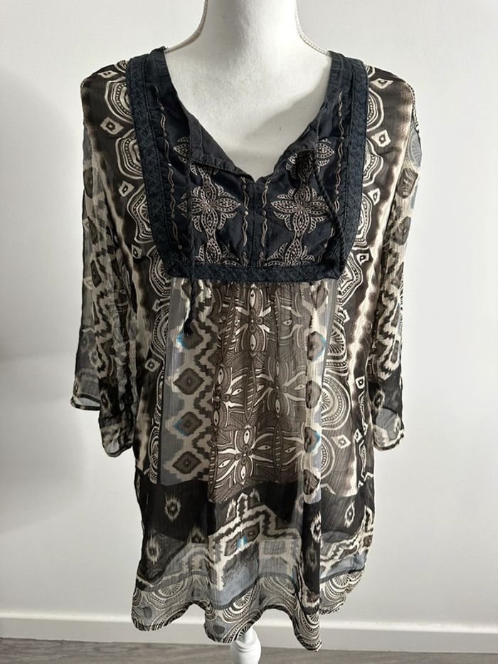 Blouse ethnique - Marron et beige - M&S Mode - Taille 38 équivalent M - En voile transparent - Coton et polyester