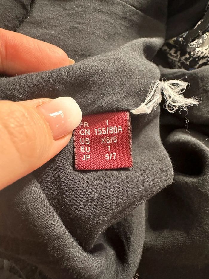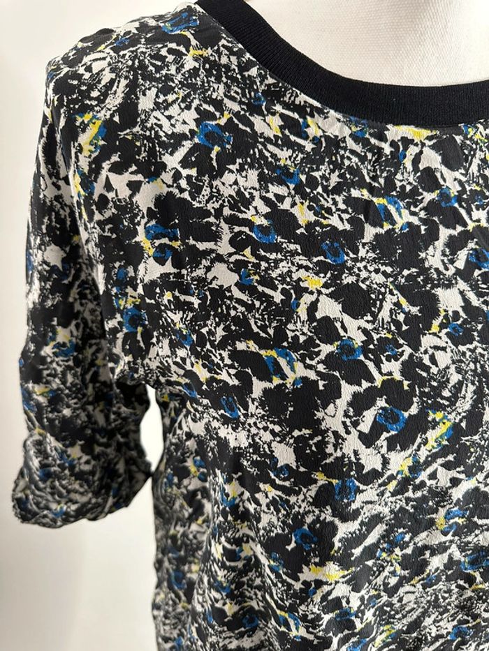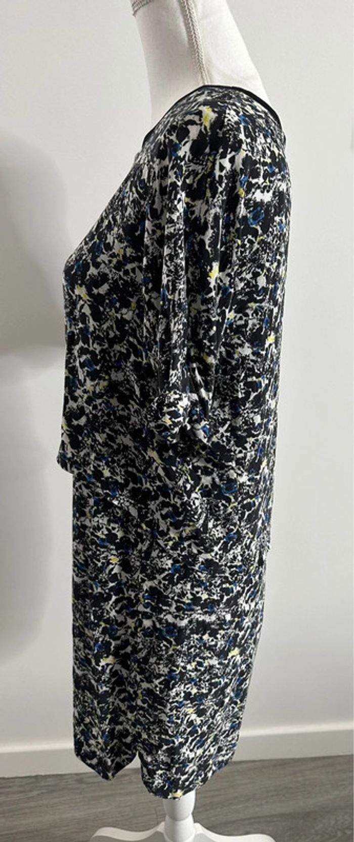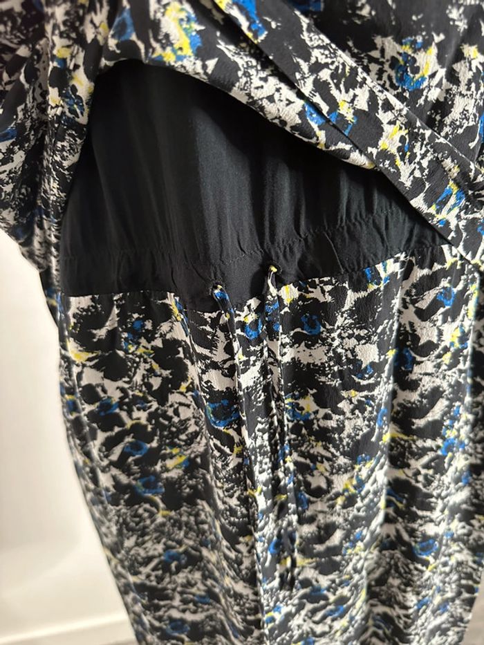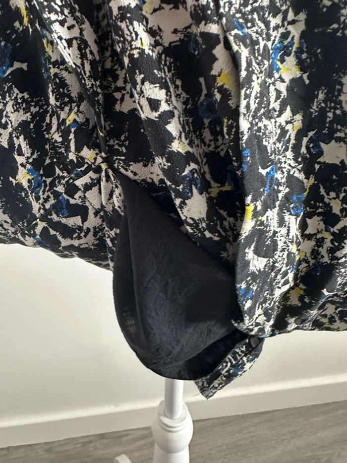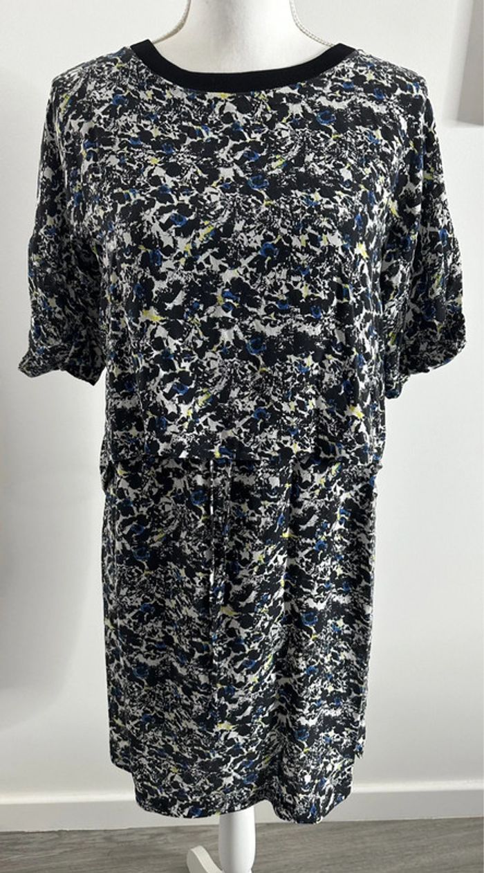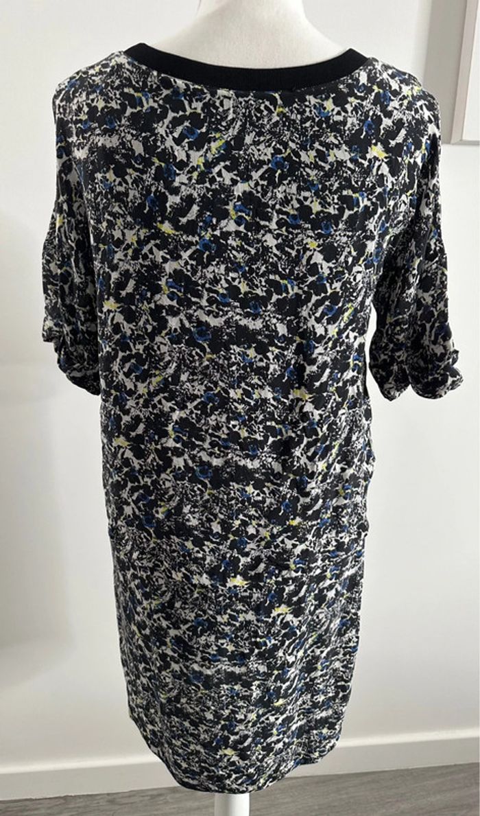 Robe bariolée - Excellent état - Noire bleue jaune et blanche - Taille 1 équivalent 36 S - Doublure intérieure - Cordon à la taille - Manches courtes - Effet superposé