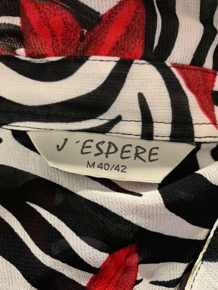 Blouse zébrée et fleurs - Excellent état - Taille 40/42 L/XL - Noire blanche et rouge - Manches courtes - Se ferme avec des boutons