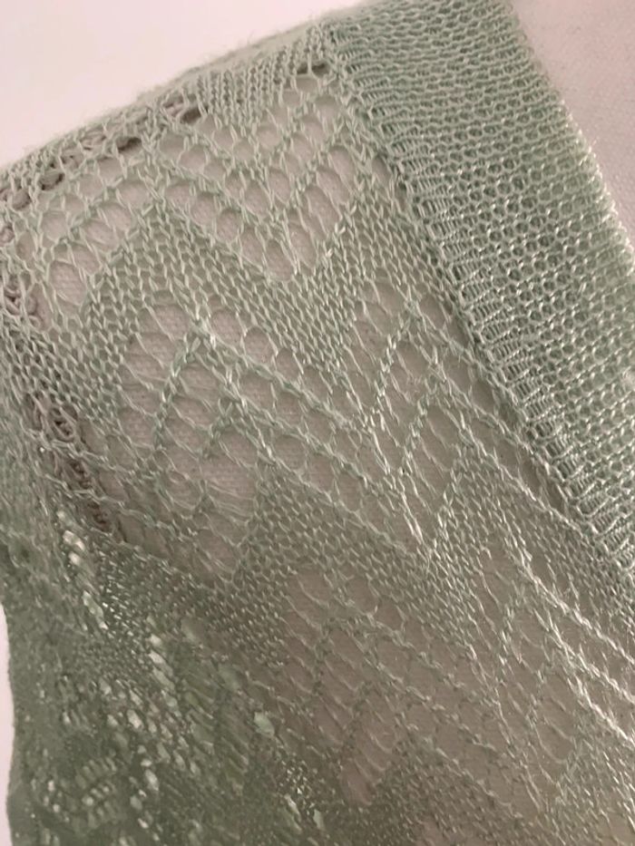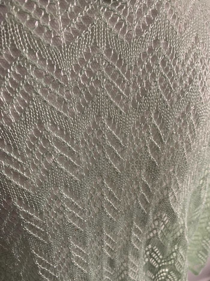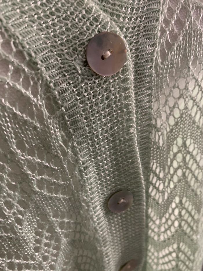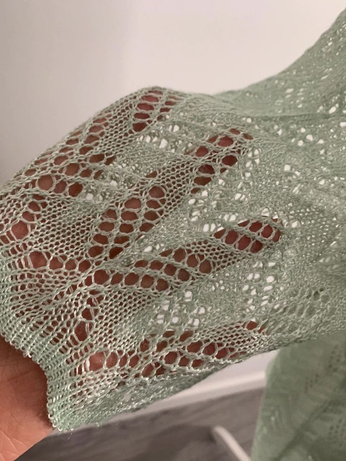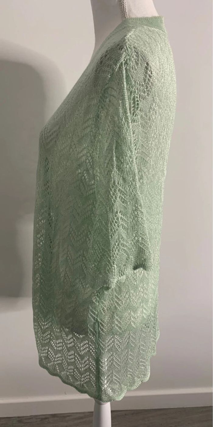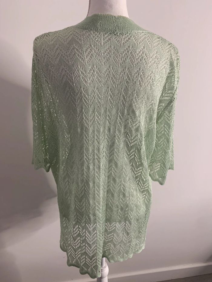 Blouse brodée - Excellent état - Vert pastel, vert menthe - Taille 42 XL - Se ferme avec des boutons - Boutons nacrés - En crochet ajouré - Manches courtes - Détails géométriques - Effet sirène mermaid
