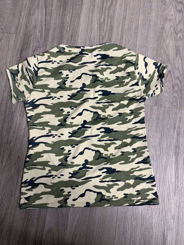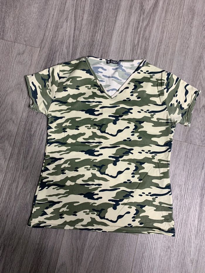 T-shirt militaire cameo - Excellent état - Manches courtes - Kaki et beige - Taille XS 34 - Col en V - Matière Stretch Dimensions: - Aisselle à aisselle 38cm - Longueur 49cm